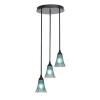 (2143-MB-725) Empire 3 Light Cluster Pendalier In Matte Black Finish With 5.5" Teal Crystal Glass. Rated for: Dry location. Light Bulb Data: 3 Medium 100 Watt. Bulb Included: No.