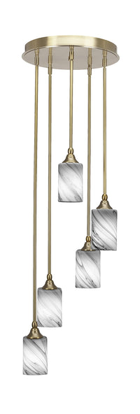 2145-NAB-3009 Empire 5 Light Cluster Pendalier In New Age Brass Finish With 4" Onyx Swirl Glass. Rated for: Dry Location. Light Bulb Data: 5 E26 100 watt. Bulb Included: No.
