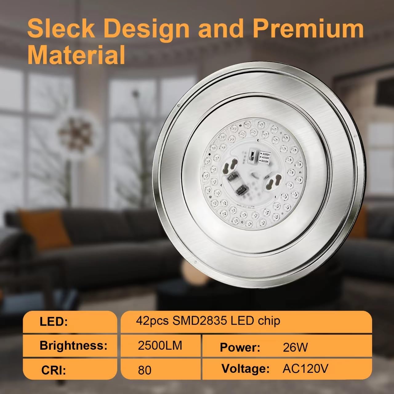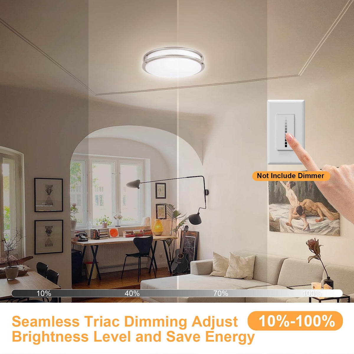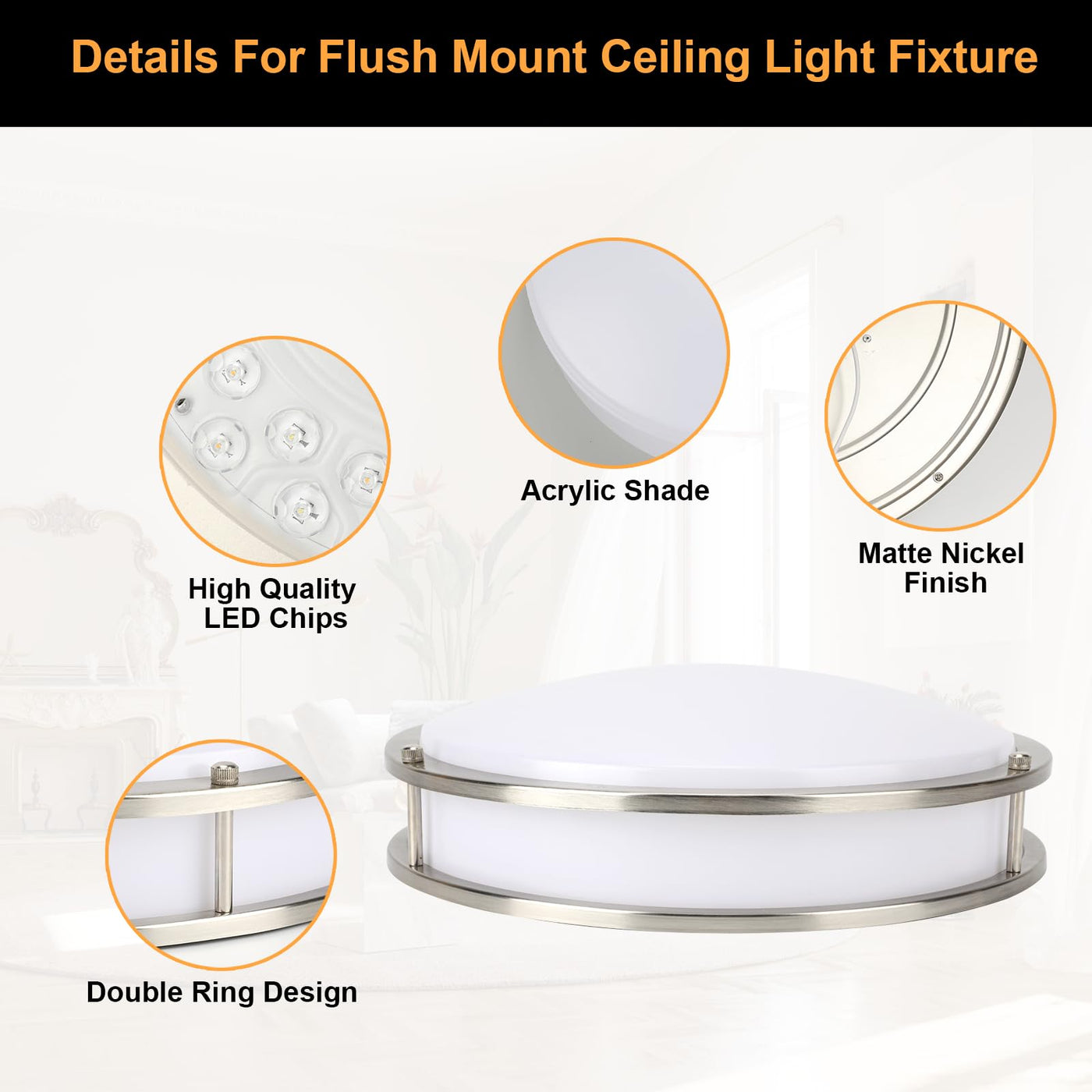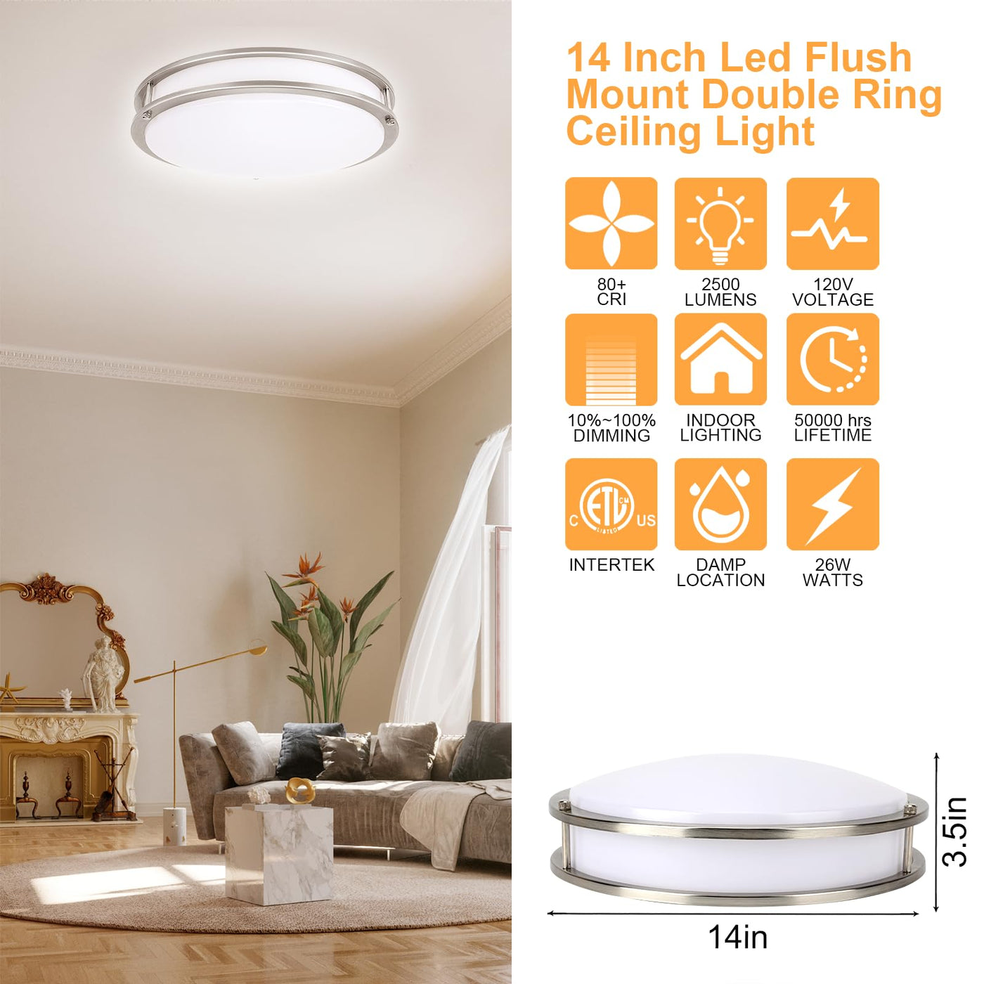 Illuminate Your Space With This 14-Inch 2500Lm Led Ceiling Light, Featuring An Energy-Efficient 26W Led And A 4000K Neutral White Color Temperature For A Comfortable Glow. The Brushed Nickel Finish Adds A Sleek, Modern Touch To Any Room. Compatible With Traditional Dimmers And Etl Certified For Safety, This Light Is Easy To Install And Perfect For Bedrooms, Kitchens, And Bathrooms.'' When It Comes To Lighting Up Your Living Space, You Deserve Nothing But The Best. Our 14 Inch Nickel Modern Dual-Ring Ceiling Light Is Designed With You, The Homeowner, In Mind. It Combines Functionality, Style, And Safety To Offer An Unbeatable Lighting Solution. Features: With 26 Watts Of Energy-Efficient Led Technology, It Pumps Out An Impressive 2200 Lumens. No More Straining Your Eyes In Dimly Lit Corners Or Relying On Multiple Light Sources To Get The Job Done. The 3000-5000K 3Cct Range Gives You The Freedom To Choose The Perfect Color Temperature For Any Moment. The High Color Rendering Index (Cri80) Is Another Aspect That Sets Our Product Apart. Specification: Item: 14-Inch Double-Ring Flush Mount Ceiling Light Diameter: 14 Inches Color Temperature: 3000K - 5000K Luminous: 2500Lm Color Rendering Index (Cri): 80 Power Consumption: 26W Certification: Etl-Listed Shape: Double-Ring Design Mounting Type: Flush Mount Materials: The Housing Is Made Of Iron, With Acrylic Cover