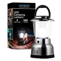 Discover the future of lighting with the Enbrighten LED Lantern with modern nickel plated finish. Enbrighten utilizes bright white LED technology, delivering consistent color temperature and unprecedented energy efficiency with a light source you never have to replace. This Enbrighten Lantern provides an omnidirectional battery-operated solution that emits bright white, 550 lumen light with 360-degree coverage. Plus Series Battery Technology allows lantern to operate efficiently on 3D or 6D batteries, up to 280 hours on the lantern's low setting and 50 hours on the high setting, using 6 D batteries. Customize your light output and energy usage with the 3-level dimming feature: low, medium and high settings. Easily hang the lantern anywhere with the locking carabineer handle. The durable, weather-resistant exterior is perfect for camping, emergencies, patios and backyards. Experience endless possibilities with Enbrighten lighting for life. This product is backed by a 5-year limited and lifetime LED .