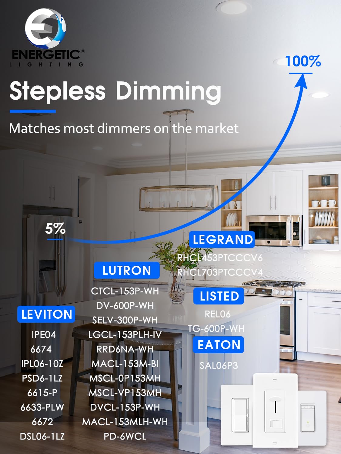 Q: Can the Energetic LED Can Lights be used with any dimmer switch?A: The Energetic LED Can Lights are compatible with most dimmer switches available on the market, ensuring you can achieve the desired lighting effect in your space without flickering.