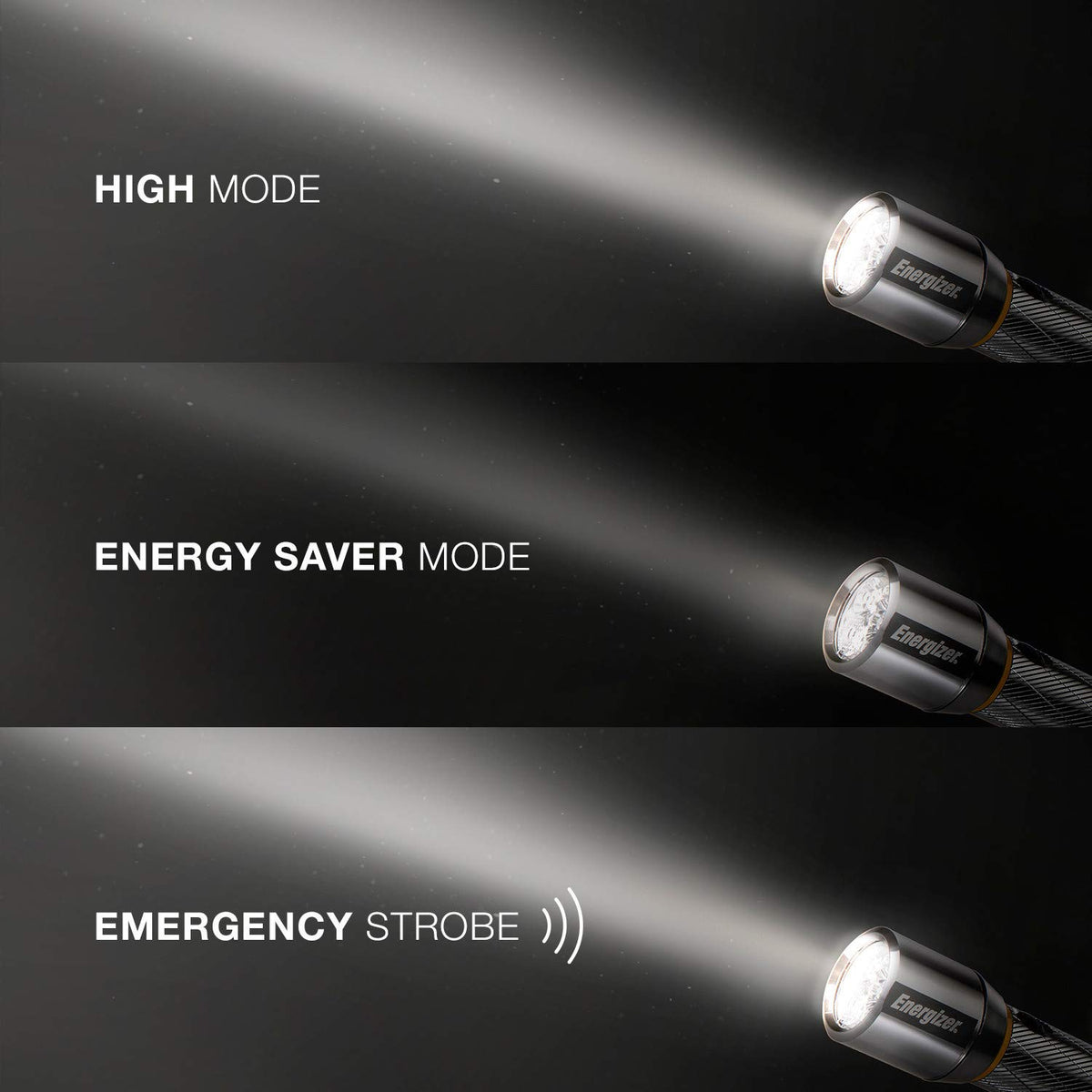Q: What light modes are available on the Energizer LED Flashlight?A: The flashlight offers three light modes: high, low, and an emergency strobe light, allowing you to adjust the brightness based on your needs.