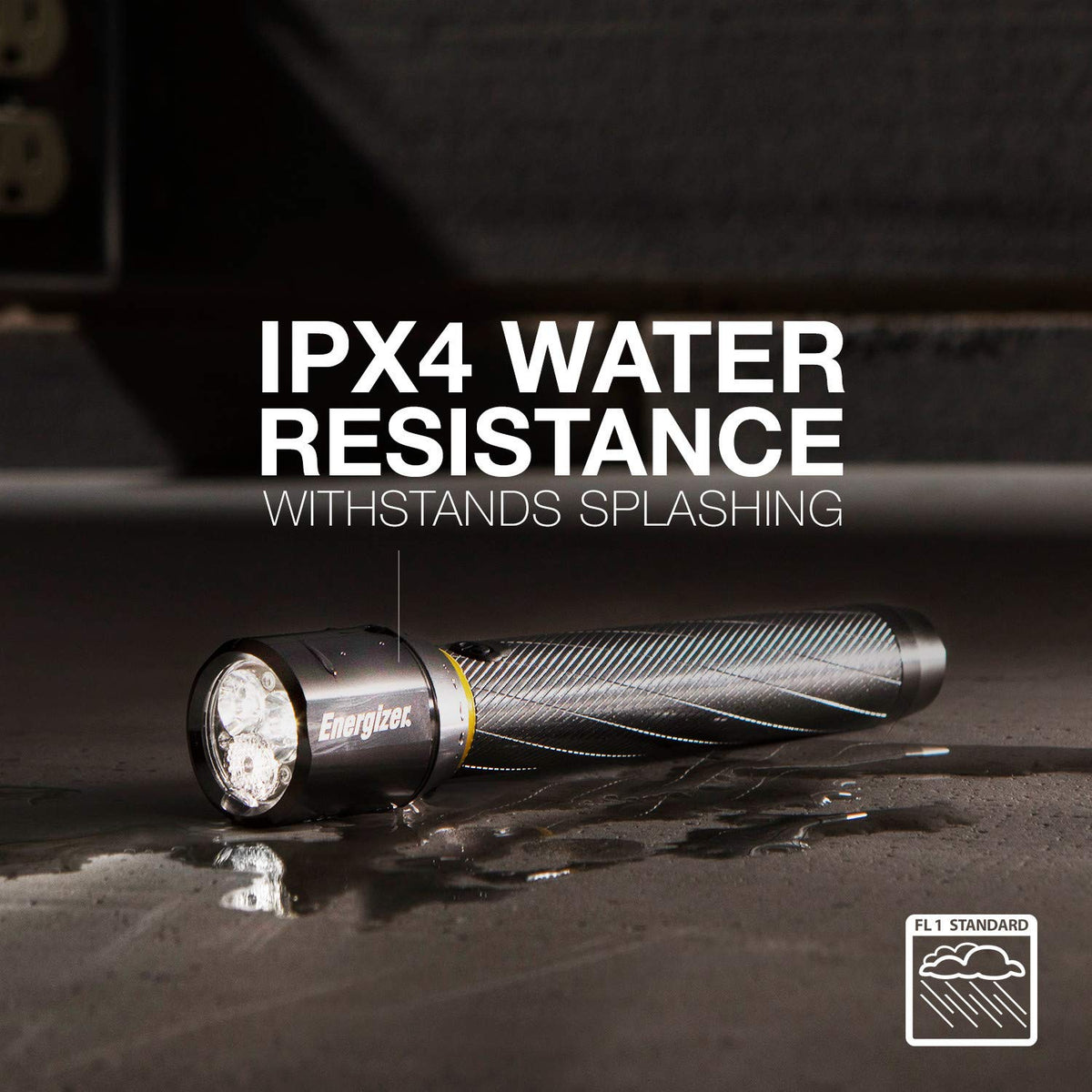 Q: Is the Energizer LED Flashlight durable for outdoor use?A: Yes, the flashlight features a durable, aircraft-grade aluminum body and has an IPX4 water-resistant rating, making it suitable for both indoor and outdoor use.