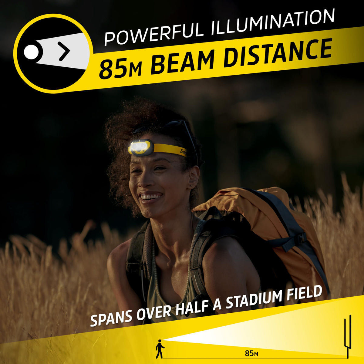 Convenient and hands-free, the Energizer Yellow & Gray LED Headlamp will keep you prepared for anything. With an adjustable strap, pivoting head, and water-resistant IPX4 rated body, this headlamp is great for camping, hunting, or hiking trips, DIY projects around the house, or to keep in any emergency kit. With 360 lumens of LED light, this compact and lightweight headlamp flashlight can help you see up to 85 meters in high mode. It features 7 convenient modes, including red night vision for outdoor activities and with VisionGuard technology, it delivers a gradual increase in intensity to protect your vision. Whether youre looking for lighting during a blackout or power outage, or you just need more light during a home project, this LED headlight has got you covered.