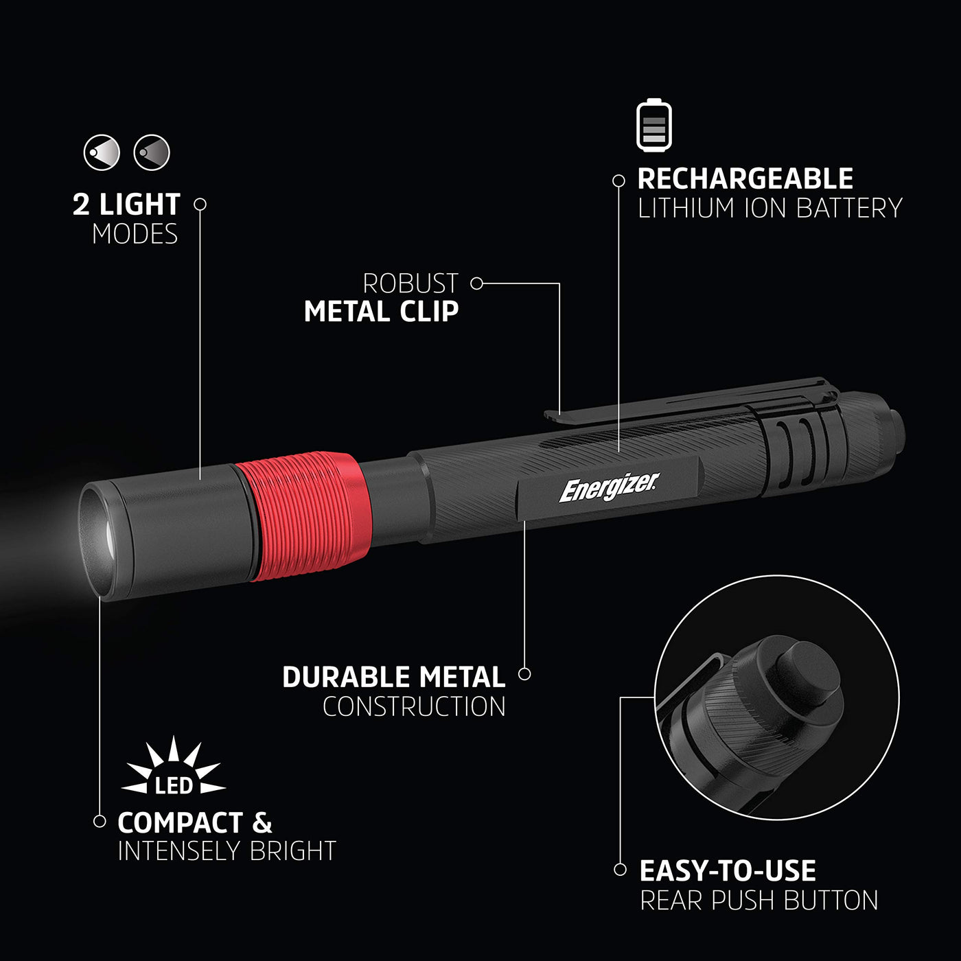 Shine a bright light when you're up close with the Energizer Rechargeable Penlight. This compact flashlight emits a powerful beam and is small enough to slip into your pocket. With a maximum output of 400 lumens on High mode, this directional LED work light is perfect for bright, close-up illumination, making it ideal for reading in the dark or checking equipment during a power outage. The non-removable lithium-ion battery ensures long-lasting performance, allowing you to recharge this portable light repeatedly. Designed with durability in mind, this tough metal flashlight features a user-friendly tail switch and a secure metal clip to attach it to your pocket or tool bag. A USB charging cable is included for added convenience. Trust in Energizer for reliable performance in any situation.