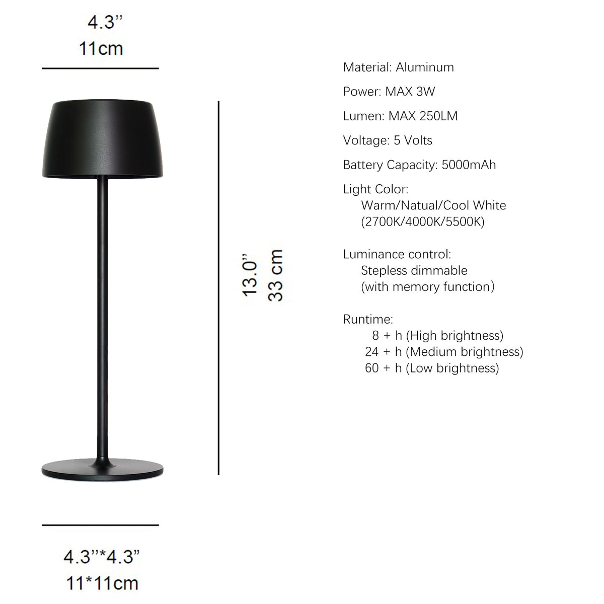 Product Description 1. Product Specifications Material: Durable Aluminum Body With Ip54 Waterproof Coating Dimensions: 4.3'' X 4.3'' X 13'' (Per Lamp) | Weight: 1 Lb (Lightweight For Portability) Battery: 1 X 5000Mah Lithium-Ion Battery (Included) | Charging Time: 4 Hours Via Usb-C Light Source: Energy-Efficient Led (3W, 250Lm) | Cri: >90 For Vibrant Color Accuracy Dimmability: 5%-100% Stepless Dimming | Color Temperatures: 2700K (Warm), 4000K (Natural), 5500K (Cool) Waterproof Rating: Ip54 (Resistant To Rain, Splashes, And Humidity) Controls: Touch-Sensitive Switch With Memory Function (Auto-Saves Last Settings) Certifications: Fcc, Rohs Compliant | Warranty: 1-Year Manufacturer Warranty 2. Product Highlights ? 2-Pack Cordless Value: Double The Convenience With Two Sleek Black Lamps-Ideal For Matching Patio Sets, Restaurant Tables, Or Bedside Pairings. ? Waterproof & All-Weather Ready: Ip54-Rated Durability Withstands Rainy Evenings On The Porch, Poolside Humidity, Or Accidental Spills During Cocktail Parties. ? Long-Lasting Rechargeable Battery: Enjoy 8-60 Hours Of Cordless Lighting (Depending On Brightness). Usb-C Fast Charging Keeps You Powered For Backyard Dinners Or Outdoor Bars. ? Smart Touch Control: Instantly Switch Between Warm, Natural, Or Cool Light For Ambiance. Long-Press To Dim From Soft Mood Lighting (5%) To Bright Task Lighting (250Lm). ? Portable Indoor/Outdoor Design: Lightweight (1 Lb) With A Stable Base For Windy Patios, Bistro Counters, Or Moving From The Dining Table To The Garden Effortlessly. ? Premium Led Performance: Energy-Saving 3W Leds With A 50,000-Hour Lifespan. Cri>90 Ensures True Colors For Makeup Vanities, Kitchen Tasks, Or Highlighting Bar Decor. 3. Perfect For These Scenes 1. Romantic Dinners & Hosting: Set Warm 2700K Lighting For Date Nights On The Patio Or Cool 5500K For Food Prep In The Kitchen. 2 .Bars & Cocktail Parties: Create A Chic Vibe At Outdoor Bars Or Poolside Gatherings. Waterproof Design Handles Drink Spills And Humid Nights. 3. Multi-Room Flexibility: Move Cordlessly From The Home Office Desk (Task Lighting) To The Porch (Ambient Glow) Without Unplugging. 4. Restaurants & Bistros: Compact Size Fits Tight Spaces On Dining Tables Or Buffet Counters. Dimmable Modes Adapt To Lunch Service Or Evening Ambiance. 5. Outdoor Celebrations: Light Up Birthday Parties, Bbqs, Or Holiday Decor On The Deck. Rainproof Build Ensures No Weather-Related Cancellations. 6. Cozy Evenings Indoors: Use Soft Dimming For Bedtime Reading Or As A Nightlight. Modern Black Finish Blends With Any Home Or Commercial D Cor. Why Enjedas Table Lamp Wins This 2-Pack Isnt Just Lighting-Its Freedom From Outlets, Weatherproof Reliability, And Mood-Setting Versatility. Whether Youre A Homeowner Craving Patio Ambiance Or A Restaurant Owner Needing Splash-Proof Task Lights, Enjeda Combines Portability With Premium Performance. The Touch-Sensitive Controls And 3 Color Temperatures Let You Adapt To Any Moment, While The Ip54 Rating Means No More Worrying About Rain Ruining Your Outdoor Party.