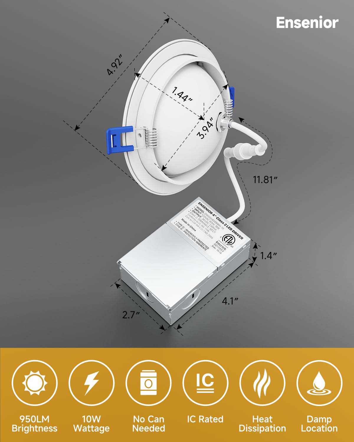Q: What are the dimensions of the Ensenior 4 inch LED gimbal recessed light?A: The Ensenior 4 inch LED gimbal recessed light has a dimension of 4.92 inches in both length and width.