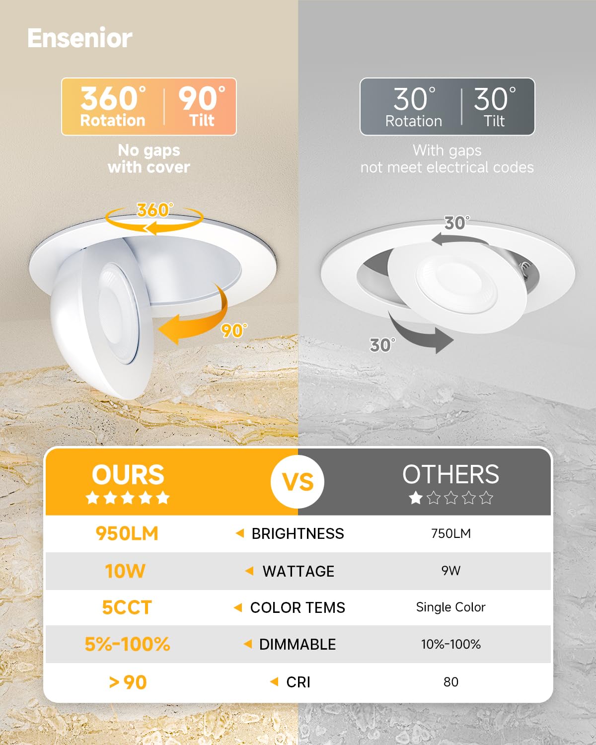 Ensenior 12 Pack 4 Inch 5Cct Led Gimbal Led Recessed Light With Junction Box, 360°+90° Adjustable Directional Eyeball Lighting, Dimmable, 2700K/3000K/3500K/4000K/5000K, 950Lm, 10W=85W-Etl&Fcc