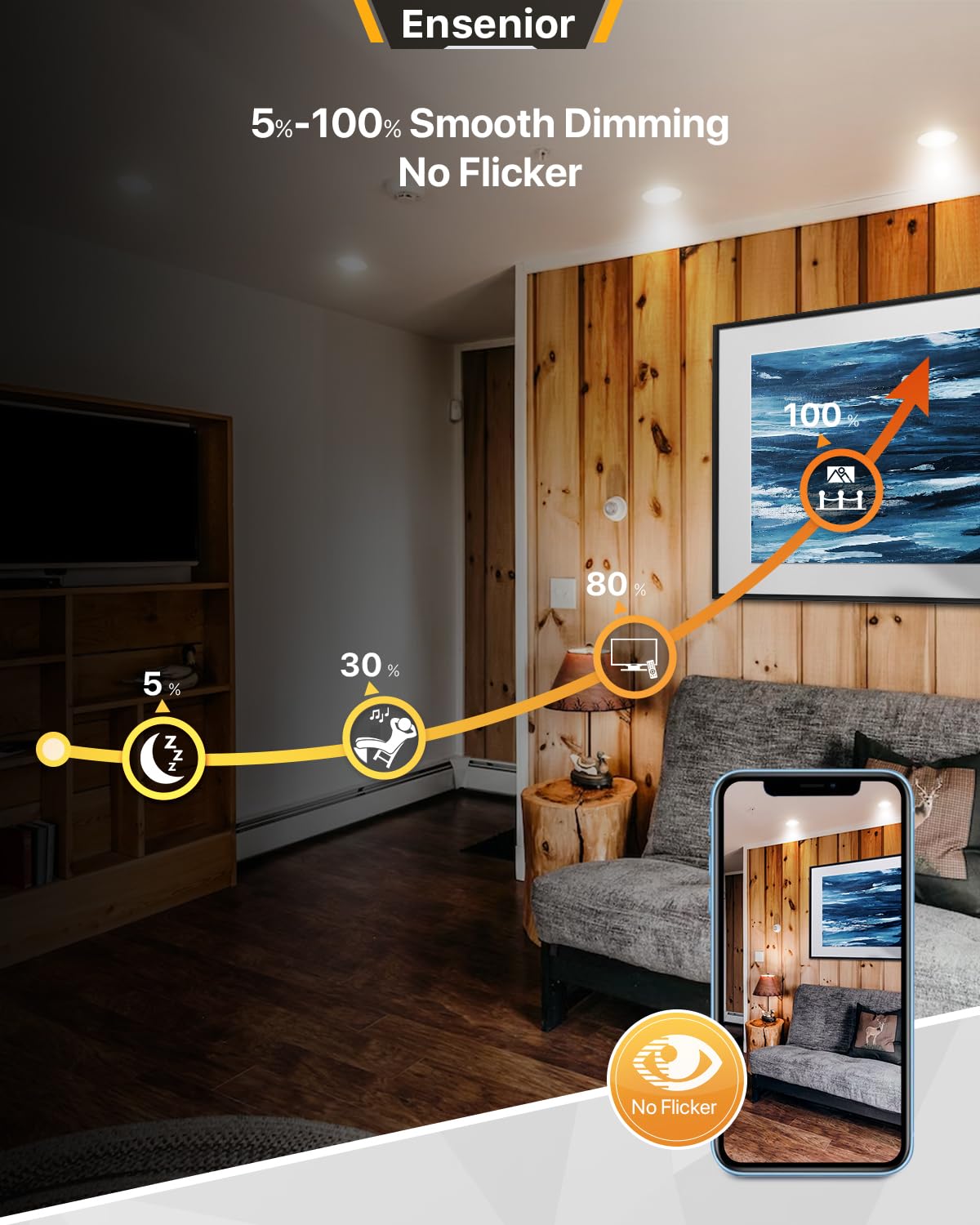 Q: Is the Ensenior LED gimbal light dimmable?A: Yes, the Ensenior LED gimbal recessed light is dimmable, allowing you to adjust the brightness from 5% to 100% to create the ideal ambiance.