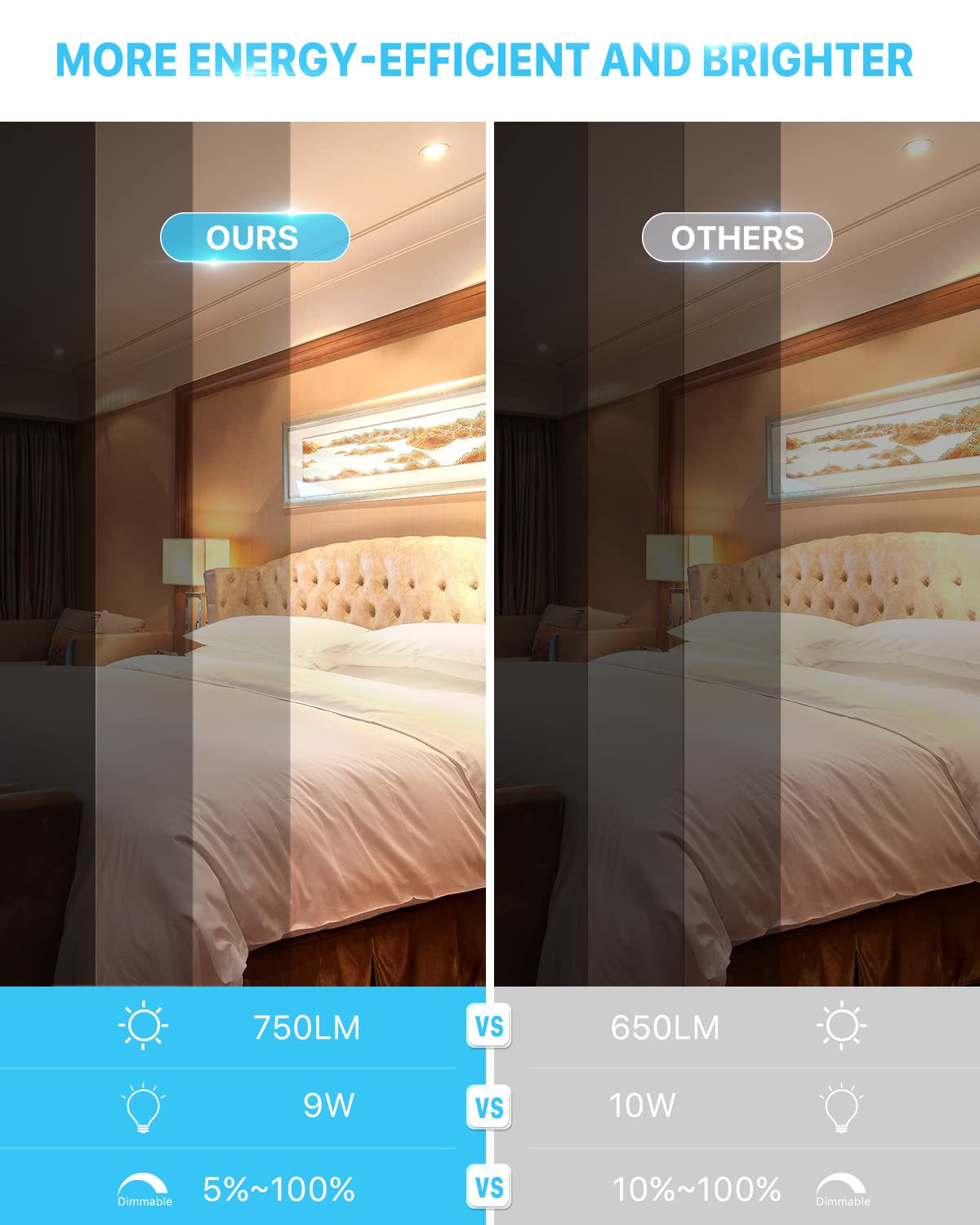 Q: How does the Ensenior recessed light compare to traditional incandescent bulbs?A: The Ensenior recessed light provides a high brightness of 750 lumens while consuming only 9 watts, which is equivalent to a 75-watt incandescent bulb. This results in energy savings of up to 88%, making it a more efficient and cost-effective lighting option.