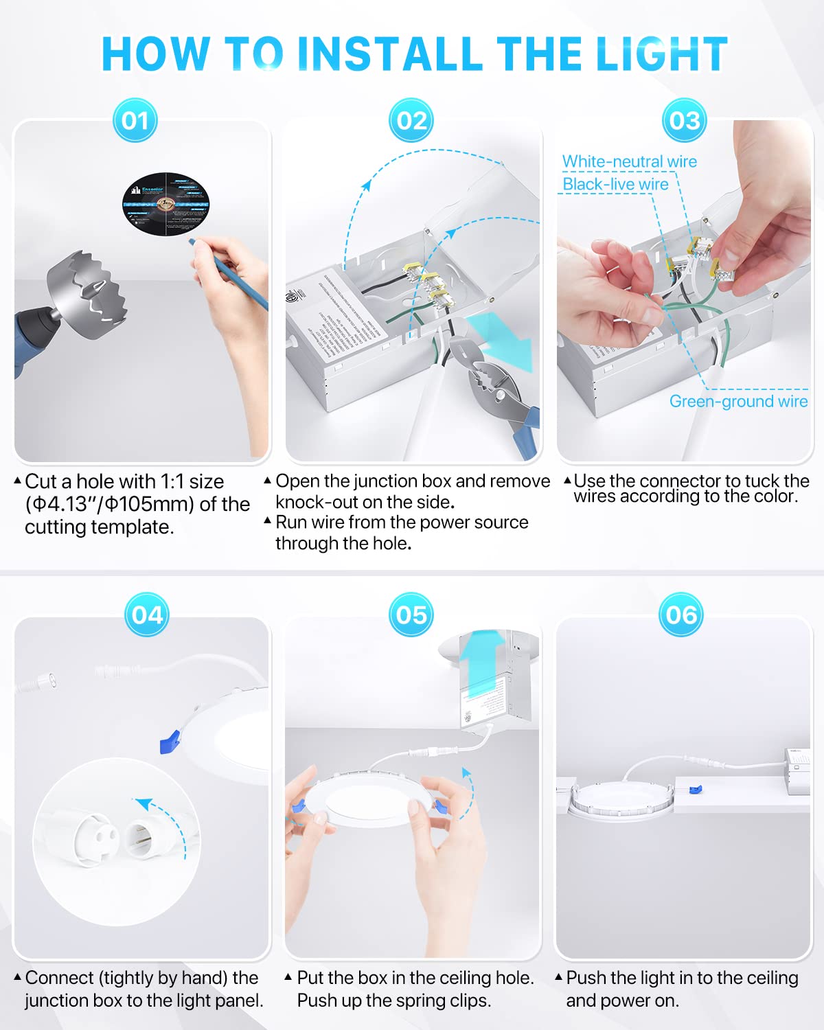 Q: What is the installation process for the Ensenior 4-inch recessed lights?A: Installing the Ensenior recessed lights is straightforward. First, cut a hole in the ceiling using the provided 1:1 template. Next, connect the junction box to the cable and use the spring clips to secure the light in place. The installation can be completed in just a few minutes and requires only 2 inches of ceiling space.