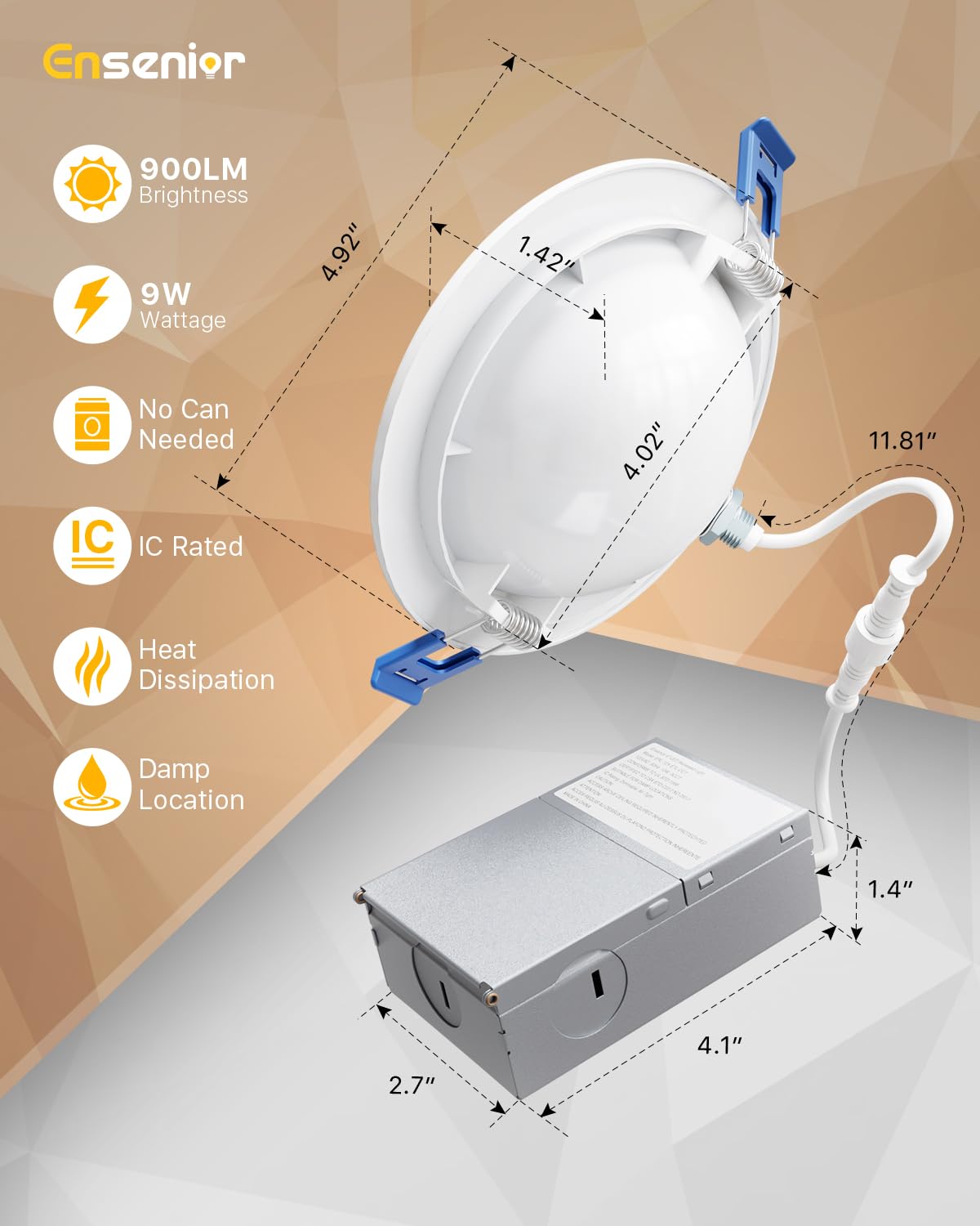 About Ensenior Ensenior Is A Brand Whose Core Values Are Customer Service And Advanced Technology. We Promise Never To Disappoint Any One Customer. Technical Specifications: ?Light Source: Led ?Item Type: Gimbal Downlights 4'' ?Wattage&Amp;Voltage:*W &Amp; 120V ?Color Temperature(Cct): 5Cct(2700K/3000K/3500K/4000K/5000K) ?Luminous Flux:900 Lm ?Cri: Ra≫90 ?Dimmable;Yes(10%~100%) ?Certification:Rohs ?Workingtemperature(?):-20-50 ?Warranty:5 Years,Lifepan Of 50,000 Hours ?Application: Kitchen, Family Room, Bedroom, Bathroom, Closets, Doorways And Even Basements Compatible Dimmers: A Buzzing Or Flickering Light Is Typically An Indication That The Dimmer Being Used Is Not Compatible With The Lights. Please Consult Dimmer Manufacturer For Maximum Lamps Per Dimmer Capacity. Package Included 4X4'' Led Downlight