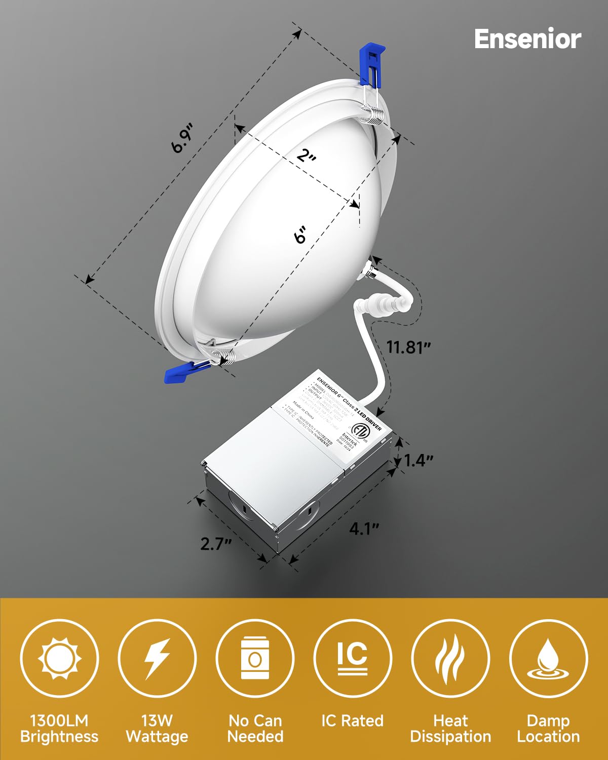 Q: What safety certifications does the Ensenior recessed light have?A: The Ensenior gimbal recessed lighting is certified with ETL and FCC standards, ensuring safety and quality while minimizing risks like flicker, noise, and RF interference.