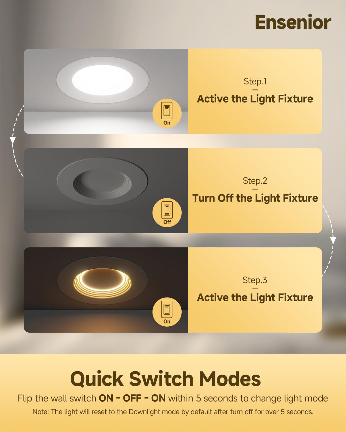 Q: What are the key features of the Ensenior 5/6 Inch LED Can Lights?A: The Ensenior 5/6 Inch LED Can Lights offer two modes in one light, a 2700K night light mode and a 5CCT downlight mode, which can be easily switched using a wall switch. Additionally, they feature a synchronization reset function, five selectable color temperatures (2700K, 3000K, 3500K, 4000K, and 5000K), and smooth dimming capabilities from 5% to 100%.