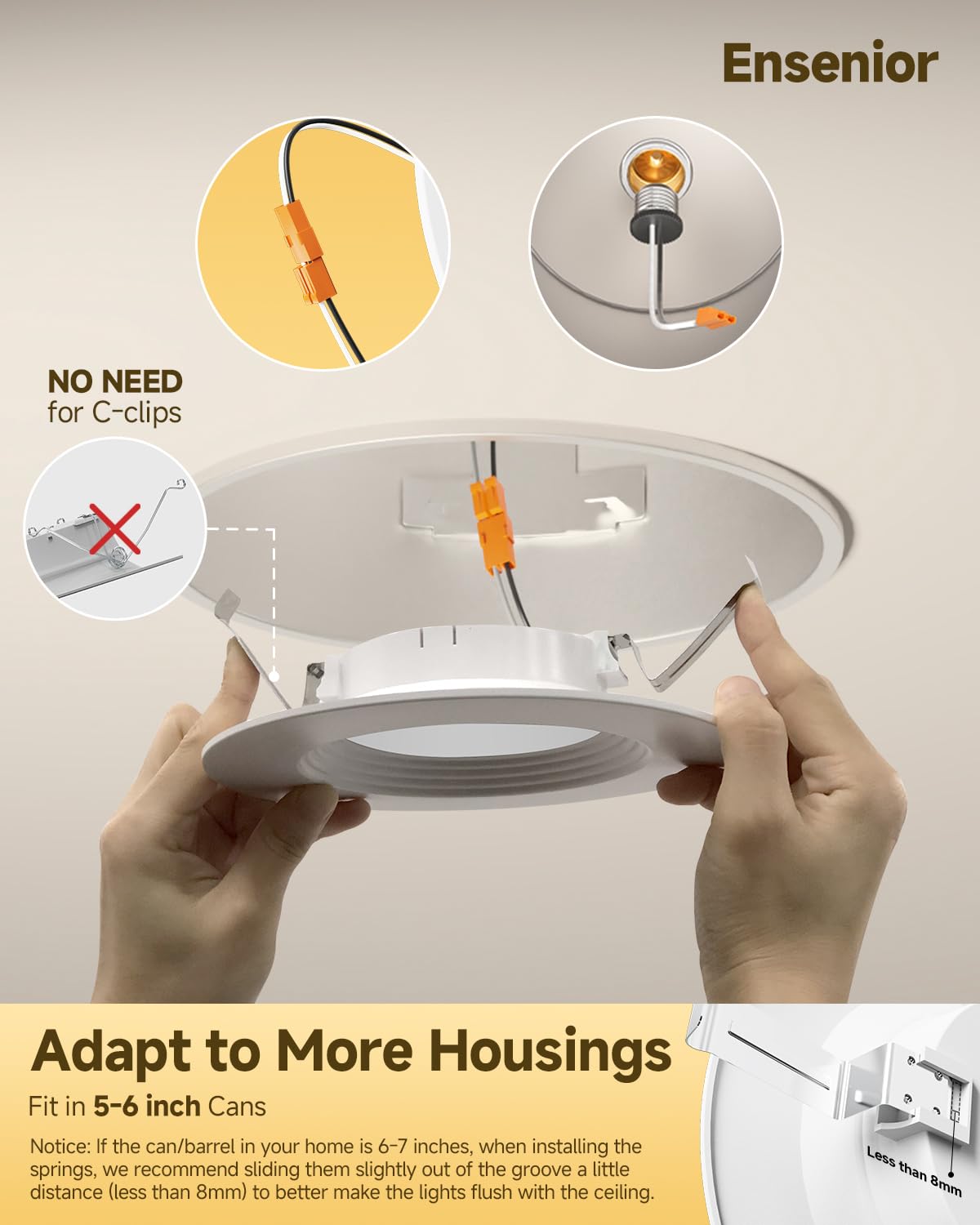 Q: How do I install the Ensenior LED Can Lights?A: Installation of the Ensenior LED Can Lights is straightforward and can be done independently without the need for C-clips. You can adjust the screws to fit either a 5-inch or 6-inch retrofit can, making them suitable for various existing setups.