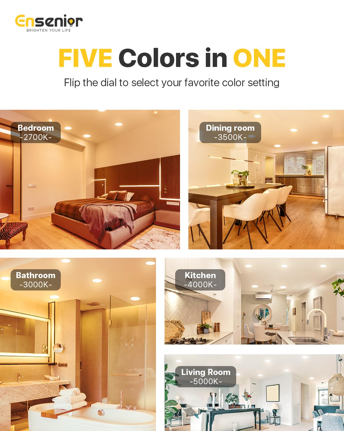 About Ensenior Ensenior Is A Brand Whose Core Values Are Customer Service And Advanced Technology. We Promise Never To Disappoint Any One Customer. Technical Specifications: ?Light Source: Led ?Item Type: Recessed Light With Nightlight ?Color Temperature: 5Cct(2700K/3000K/3500K/4000K/5000K) ?Cri: Ra≫80 ?Dimmable;Yes(5%~100%) ?Certification:Etl&Amp;Fcc&Amp ?Workingtemperature(?):-20-50 ?Warranty:5 Years,Lifepan Of 50,000 Hours ?Application: Kitchen, Family Room, Bedroom, Bathroom, Closets, Doorways And Even Basements Compatible Dimmers: Related Compatible Dimmers Could Be Viewed In The User Manual Or You Could Consult Customer Service. Package Included 6P Led Recessed Light With Nightlight