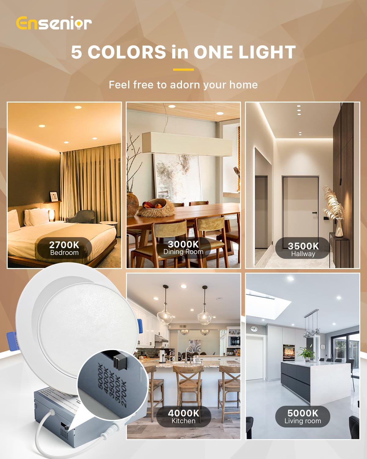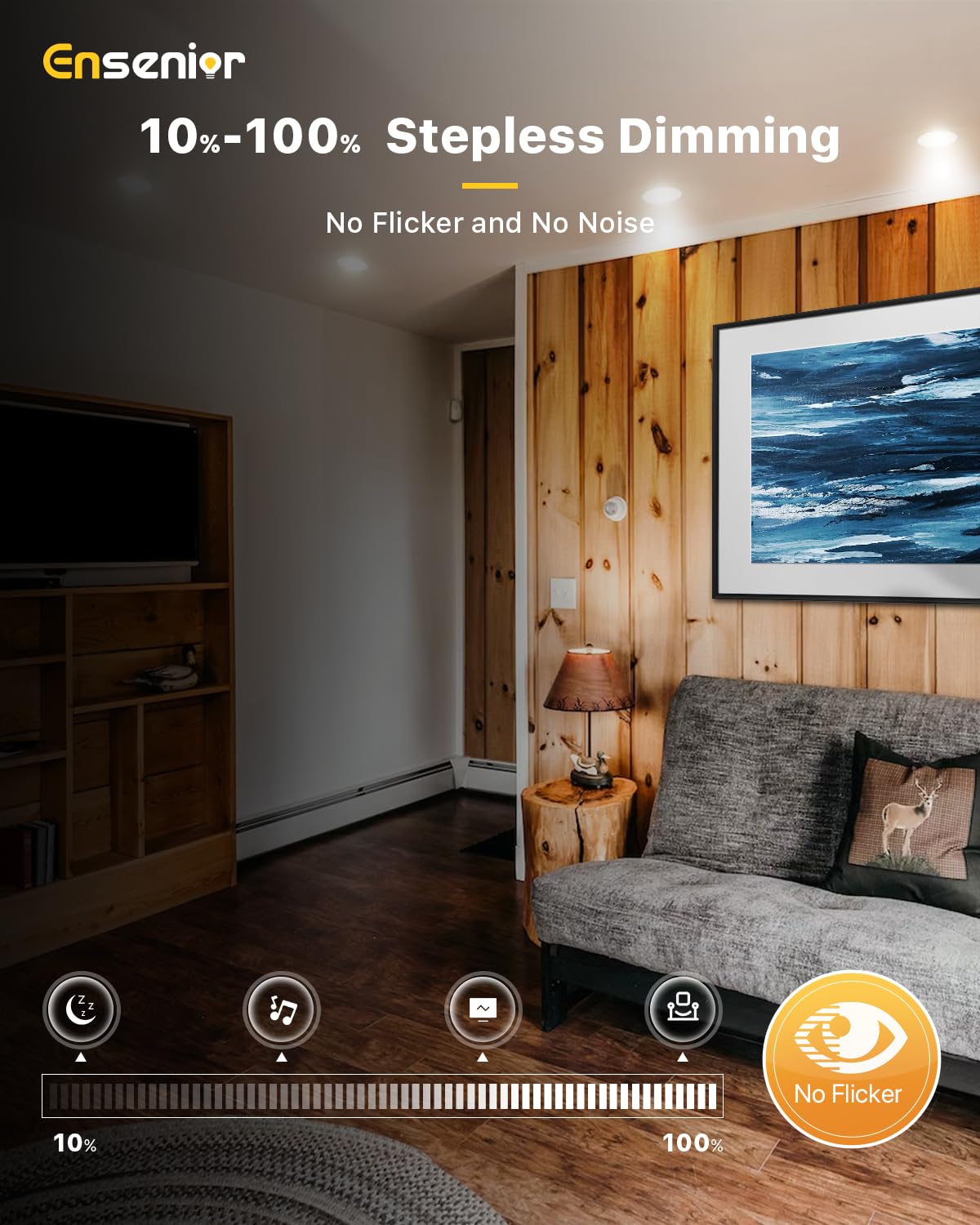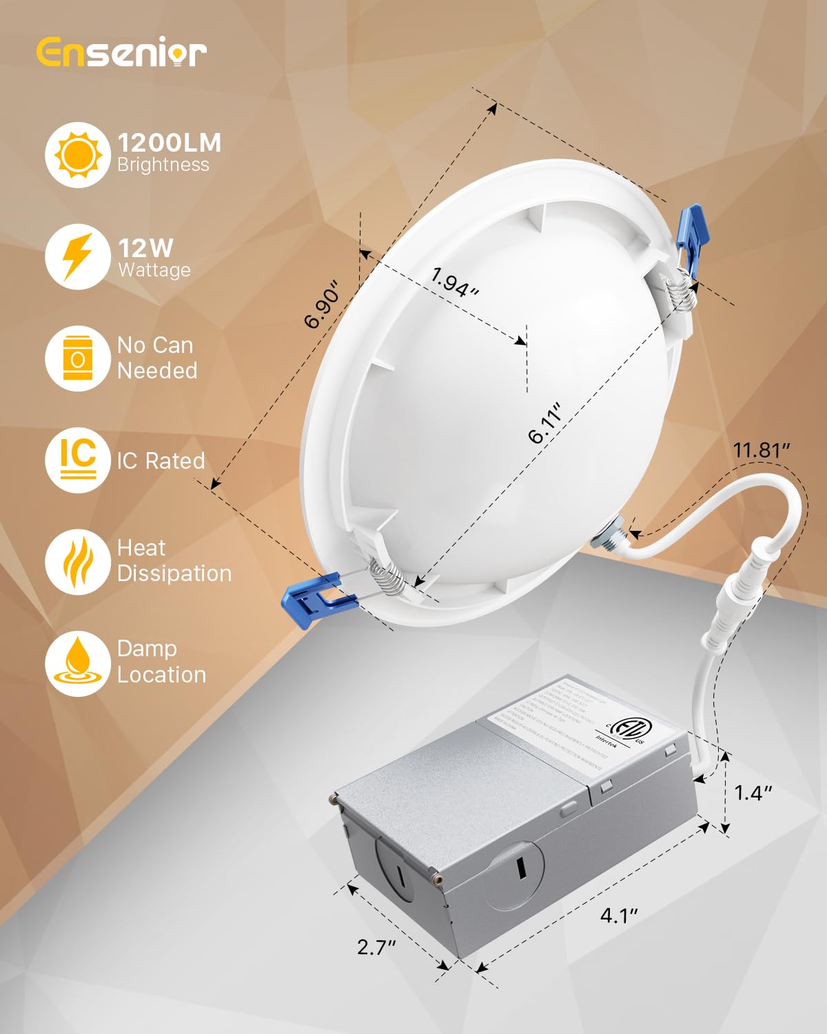 About Ensenior Ensenior Is A Brand Whose Core Values Are Customer Service And Advanced Technology. We Promise Never To Disappoint Any One Customer. Technical Specifications: ?Light Source: Led ?Item Type: Gimbal Downlights 6'' ?Wattage&Amp;Voltage:*W &Amp; 120V ?Color Temperature(Cct): 5Cct(2700K/3000K/3500K/4000K/5000K) ?Luminous Flux:1200 Lm ?Cri: Ra≫90 ?Dimmable;Yes(10%~100%) ?Certification:Rohs ?Workingtemperature(?):-20-50 ?Warranty:5 Years,Lifepan Of 50,000 Hours ?Application: Kitchen, Family Room, Bedroom, Bathroom, Closets, Doorways And Even Basements Compatible Dimmers: A Buzzing Or Flickering Light Is Typically An Indication That The Dimmer Being Used Is Not Compatible With The Lights. Please Consult Dimmer Manufacturer For Maximum Lamps Per Dimmer Capacity. Package Included 4X6'' Led Downlight