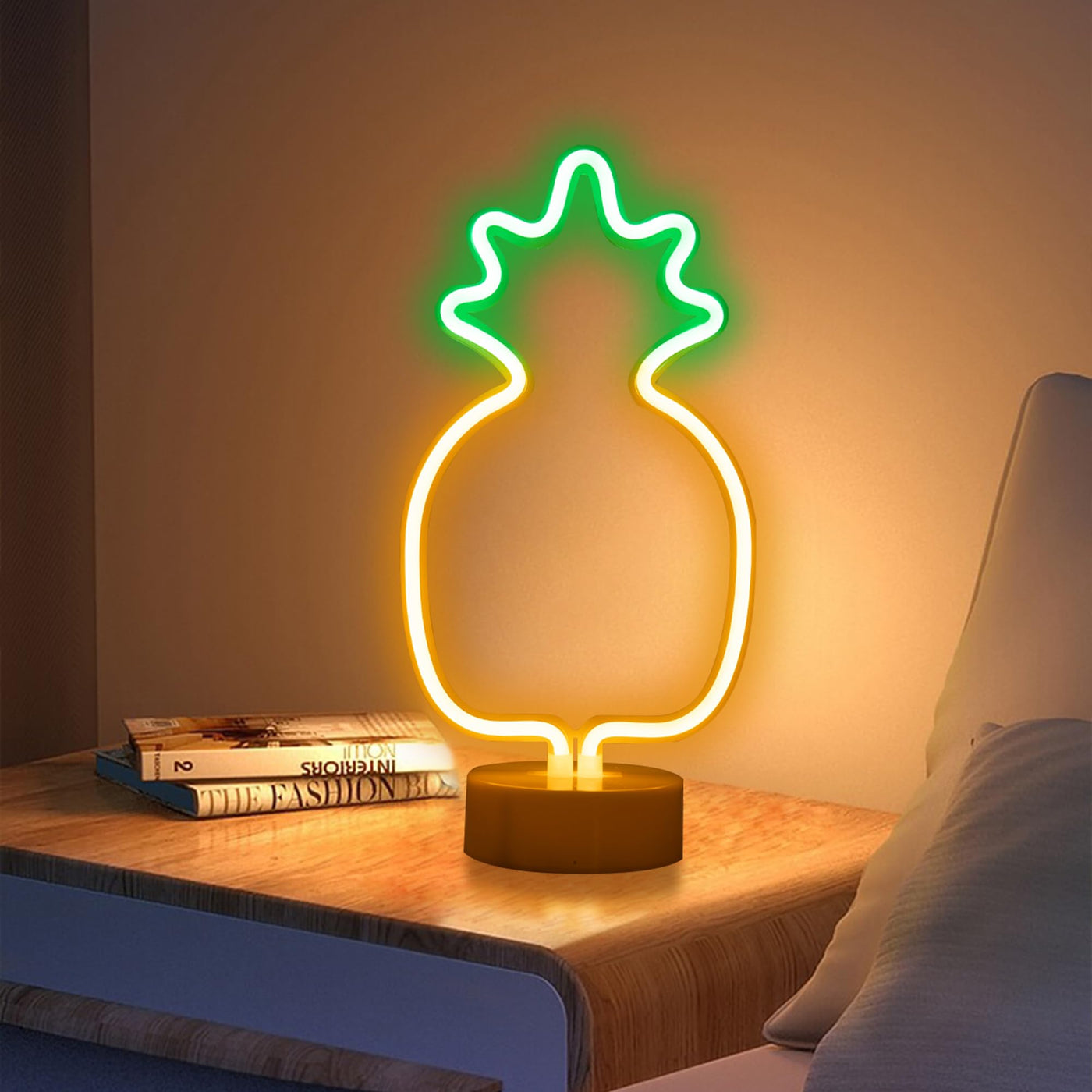 Colour Name: Warm White Pineapple Neon Signs Lights With Pedestal. Specification Material: Plastic + Led Neon Night Light Bulb: Led Warm White Lamps Power:2W Power:3*Aa Batteries (Not Included) Application: Indoor And Outdoor (In Dry Weather) Use, Home Or Novelty Decoration. With Pedestal Can Be Placed On The Table Or Any Corner Of The Family. Add An Elegant Glow To Your Table Decoration By Our Night Lights . This Product Is Safe And Multi-Functional, No Wiring Required, Fast And Easy To Install. Safety In Use, Requires 3 X Aa Batteries (Not Included),Have On And Off Switch. The Best Choice For Living Room, Bedroom, Party, Christmas, Birthday Gift. Attention Store The Light In A Cool And Dry Place And Remove Batteries If Product Is Not To Be Used For A Long Time. Please Handle This Product With Care To Avoid Damage. If Hanging, Please Ensure The Hook Has Some Extra Space For Easier Operation On The Switch.