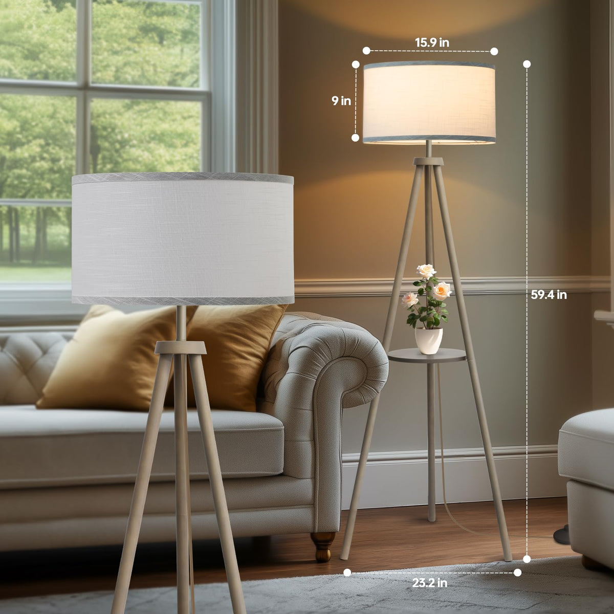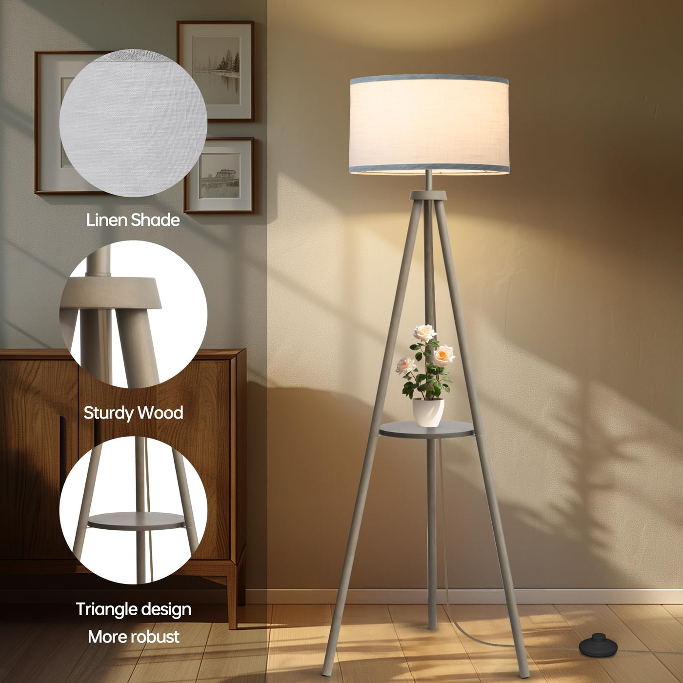 Q: What materials are used in the EOEYYOYB Floor Lamp's construction?A: The EOEYYOYB Floor Lamp features a premium natural rubber wood tripod base for stability and aesthetics, along with a petite shelf for convenience. The lamp is designed with a durable white drum shade that complements the wooden base.