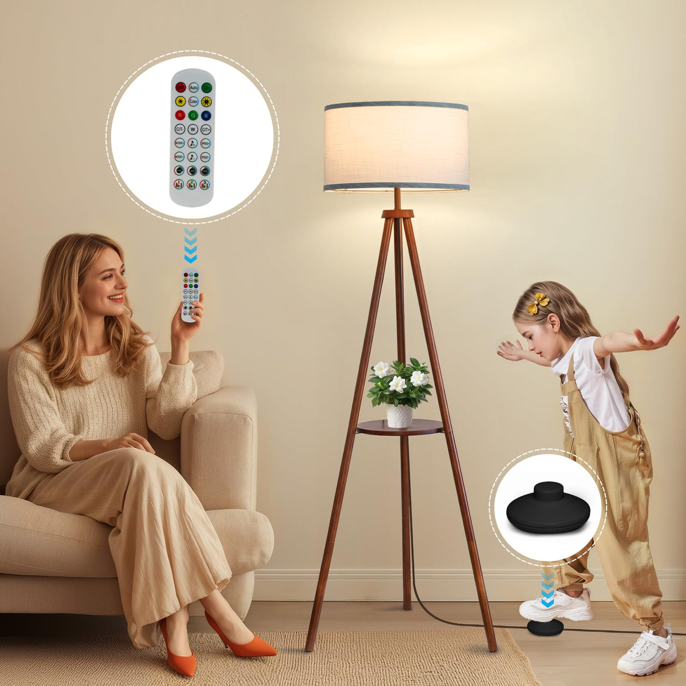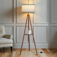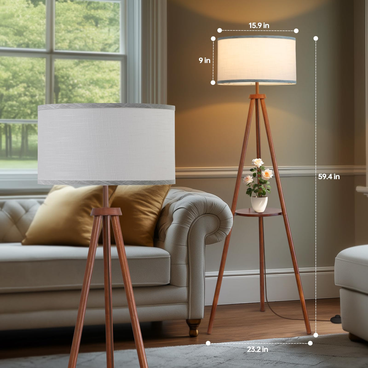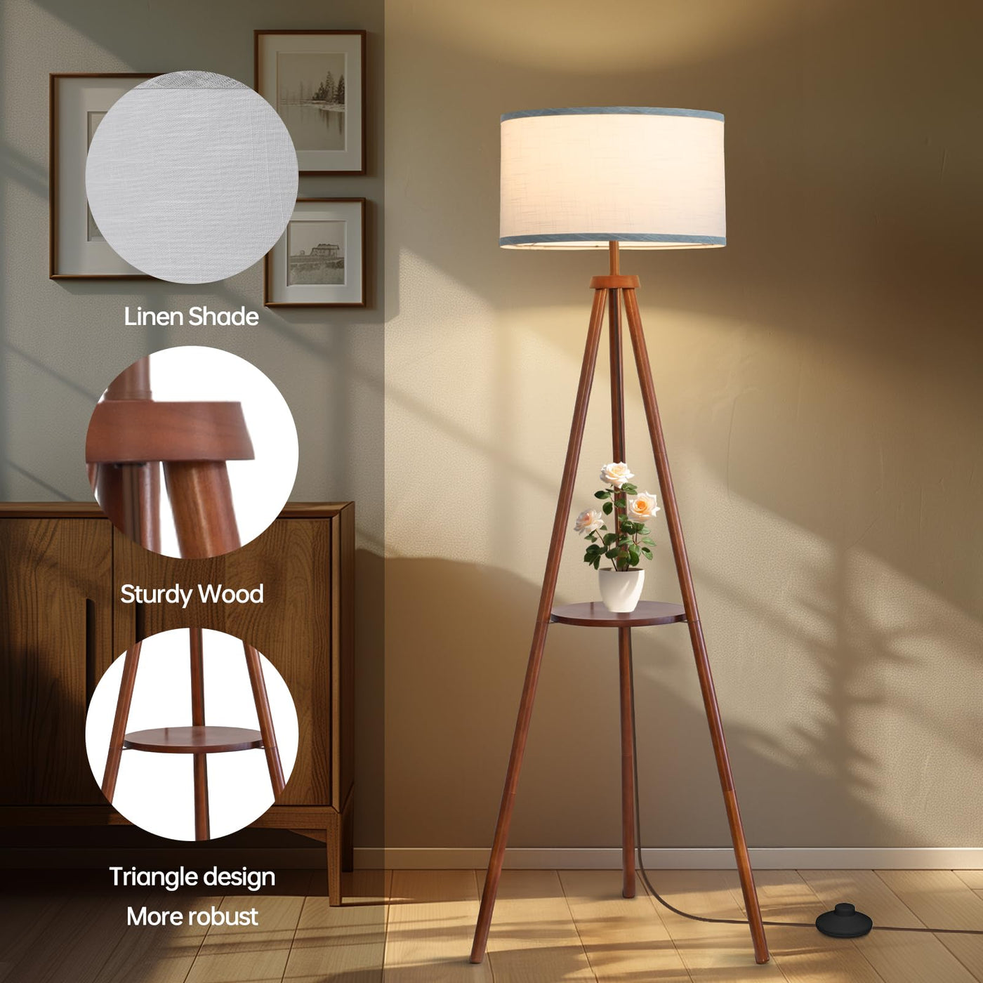 Q: What materials are used in the construction of this floor lamp?A: The EOEYYOYB floor lamp features a premium natural rubber wood tripod base, ensuring durability and stability. The lamp also includes a petite shelf for added functionality, and its design is complemented by a white drum shade that enhances its aesthetic appeal.