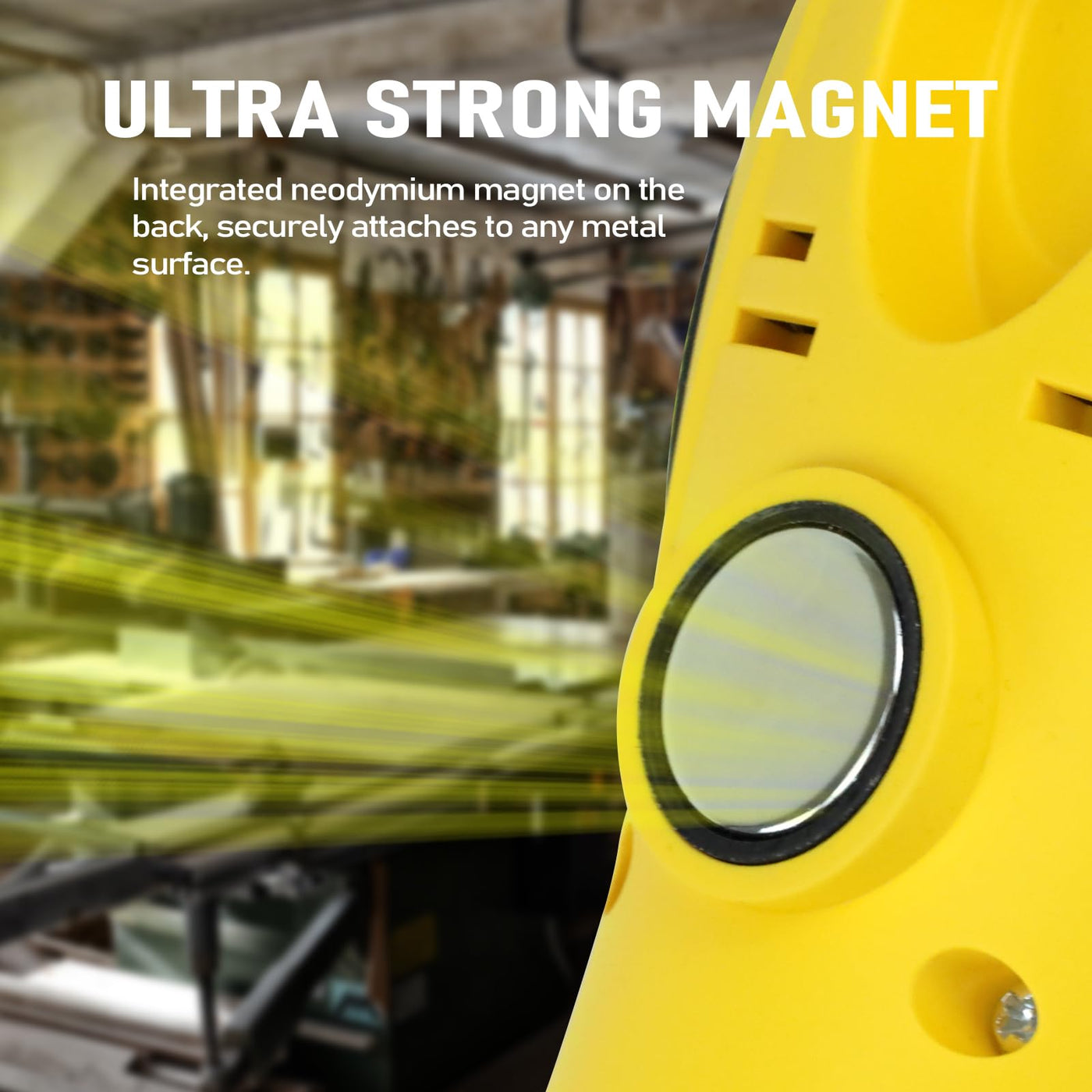 Q: What is the advantage of the magnetic base on this work light?A: The strong magnetic base allows for hands-free operation by securely attaching the work light to any metal surface, providing convenience and flexibility while you work.