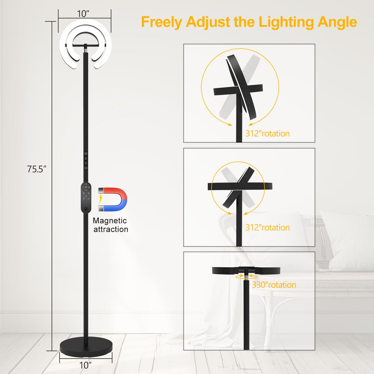 Epabina Floor Lamp For Living Room, 75.5 Inch Tall Standing Lamp For Bedroom With 2 312 Rotatable Ring Lights, 36W Bright Steple