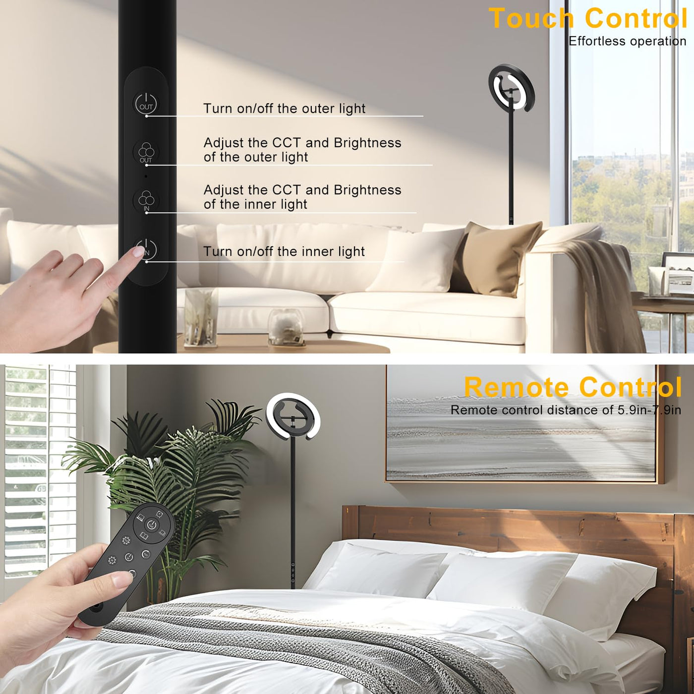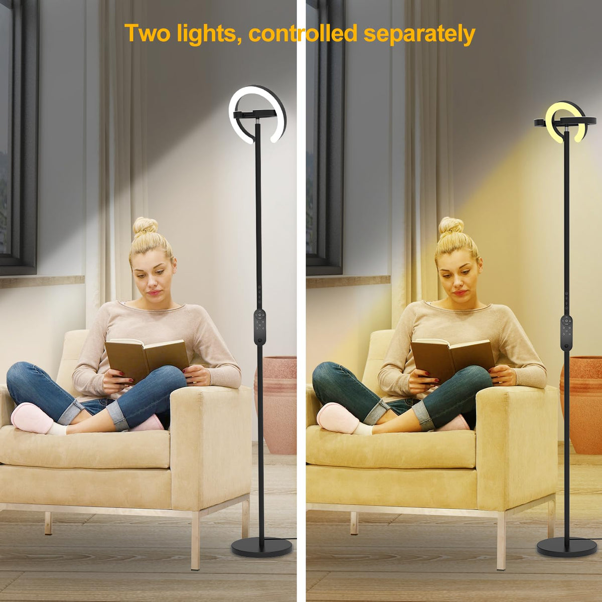 The Epabina tall living room lamp is designed for modern living spaces. It offers a bright and versatile illumination solution for reading room and bedrooms. It features 2 rotatable C-shaped light source design, both adjustable in angles, brightness and color temperature, allowing for freely horizontal and vertical adjustment and catering to various task and ambiance needs. It's not just a practical way to brighten up your home and office, it's also a statement piece of decoration that adds elegance to your room. Whether you're showcasing artwork, making nail art, reading, working, or simply enjoying your living space. Ideal for study rooms, offices, and dining rooms.