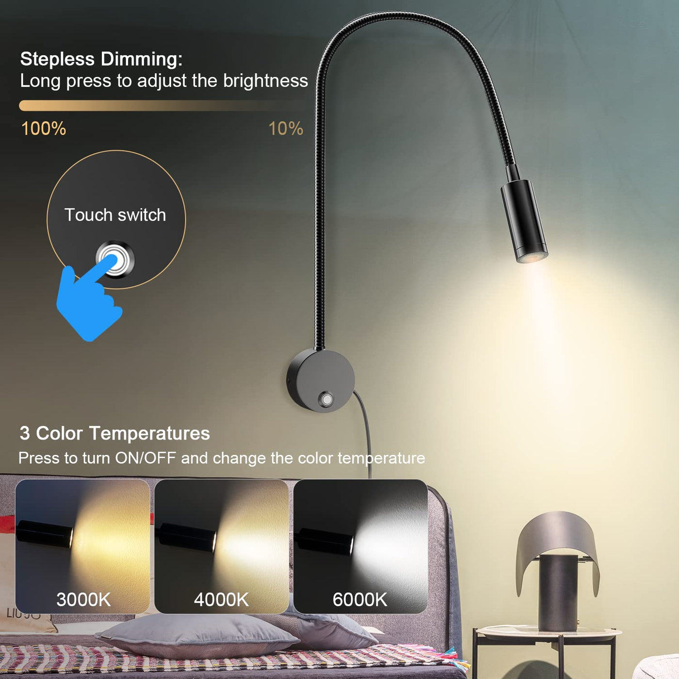 Q: How does the stepless dimming feature work on this reading light?A: The stepless dimming feature allows you to adjust the brightness smoothly by simply touching the control. You can also switch between three color temperatures: white, natural, and warm white, to create the perfect ambiance for reading.