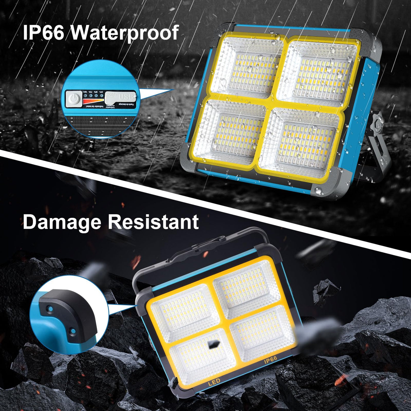 Q: Is the work light waterproof and suitable for outdoor use?A: Yes, this work light has an IP66 waterproof rating, making it resistant to water spray and suitable for outdoor activities like camping and hiking.