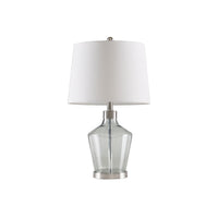 Q: What is the design style of the Ergode Angular Glass Table Lamp?A: The Ergode Angular Glass Table Lamp features a modern and sophisticated design with a sleek grey glass body and a white tapered drum shade, making it a stylish addition to any room decor.