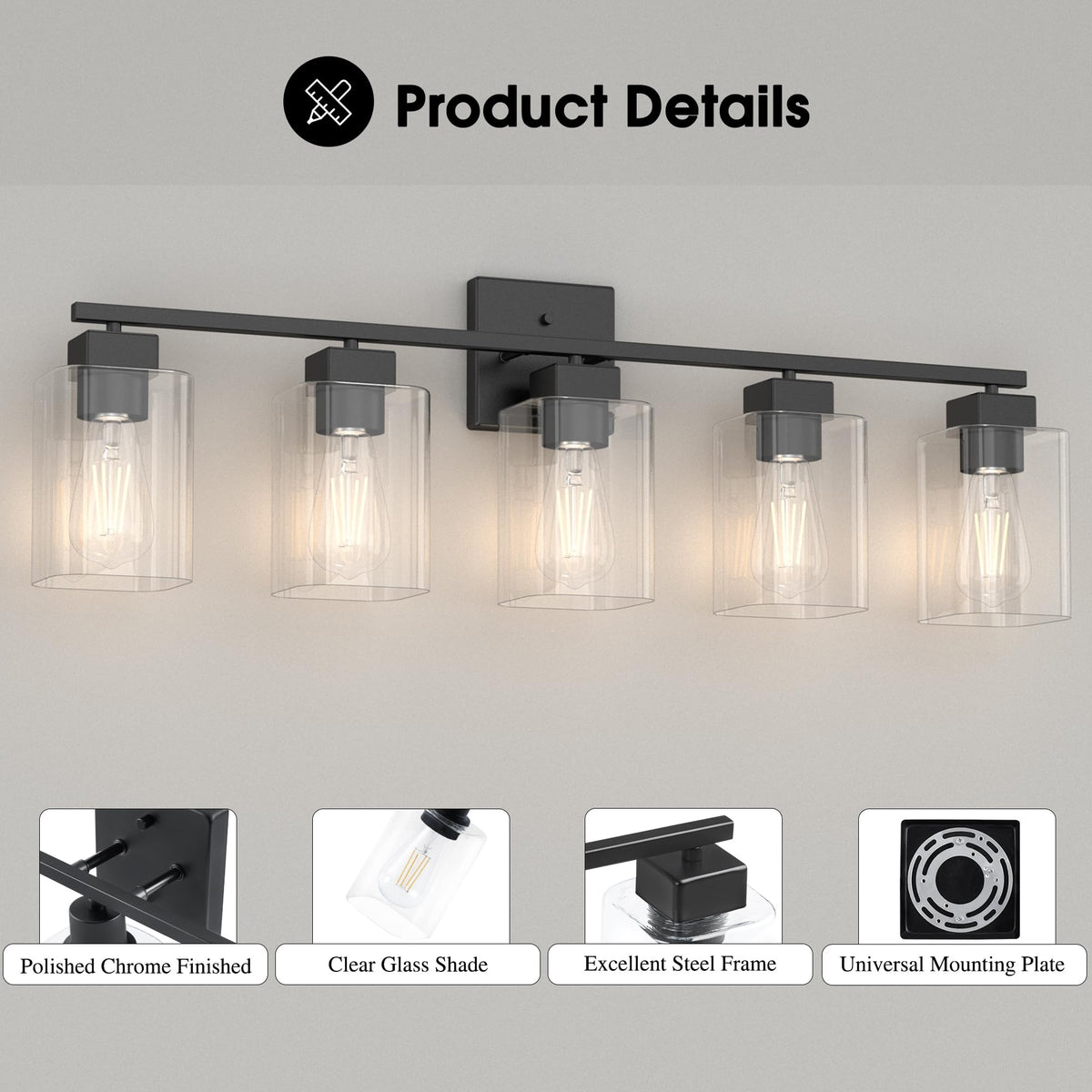 Discover a timeless elegance with our wall mounted bathroom light fixtures. This stunning restroom light combines a matte black metal frame with a thick square design back plate and glass shades, offering a look that's both simple and sophisticated. Our three light bathroom vanity light are perfect for providing ample lighting in various settings, including bathrooms, restrooms, toilets, living rooms, bedrooms, hallways, cabinets, porches, kitchens, and farmhouses. As luces para ba? modernas, our products are crafted from robust metal and thick glass, ensuring durability and safety. The 5 bulb bathroom light fixture are UL certified, making them a reliable and long-lasting choice. The powder room light fixtures feature a solid all-metal lamp body, reinforced with metal support rings, to guarantee resilience during transportation, use, and installation. We've also taken extra care in packaging our vanity sconces for bathroom to prevent any breakage of the glass covers. When it comes to specifications, our lamparas para ba? measures L31?W4.8?H10.04 while the square glass shades measure L3.94? W3.94? H5.9 Operating within a voltage range of 110-120V, our l?para de pared para ba? for bathroom is compatible with E26 bulbs (MAX60), including LED, CFL, incandescent, and vintage filament bulbs (not included). Installing our bathroom light fixtures 5-light is easy and straightforward. Your purchase includes not just the metallic 5 light vanity light fixture farmhouse matte black but also 5 square clear glass shades and an instruction manual to guide you through the process. If you encounter any issues during installation, we're here to help, allowing you to save on installation costs. We're committed to providing the best experience for our customers. That's why we offer a 3-year guarantee for our bathroom lights over medicine cabinet. If your product gets damaged or the clear glass shades break during transportation, we'll provide a free exchange. Choose our matte bathroom lamps for wall and bathroom lighting clearance to illuminate your space with style and sophistication.