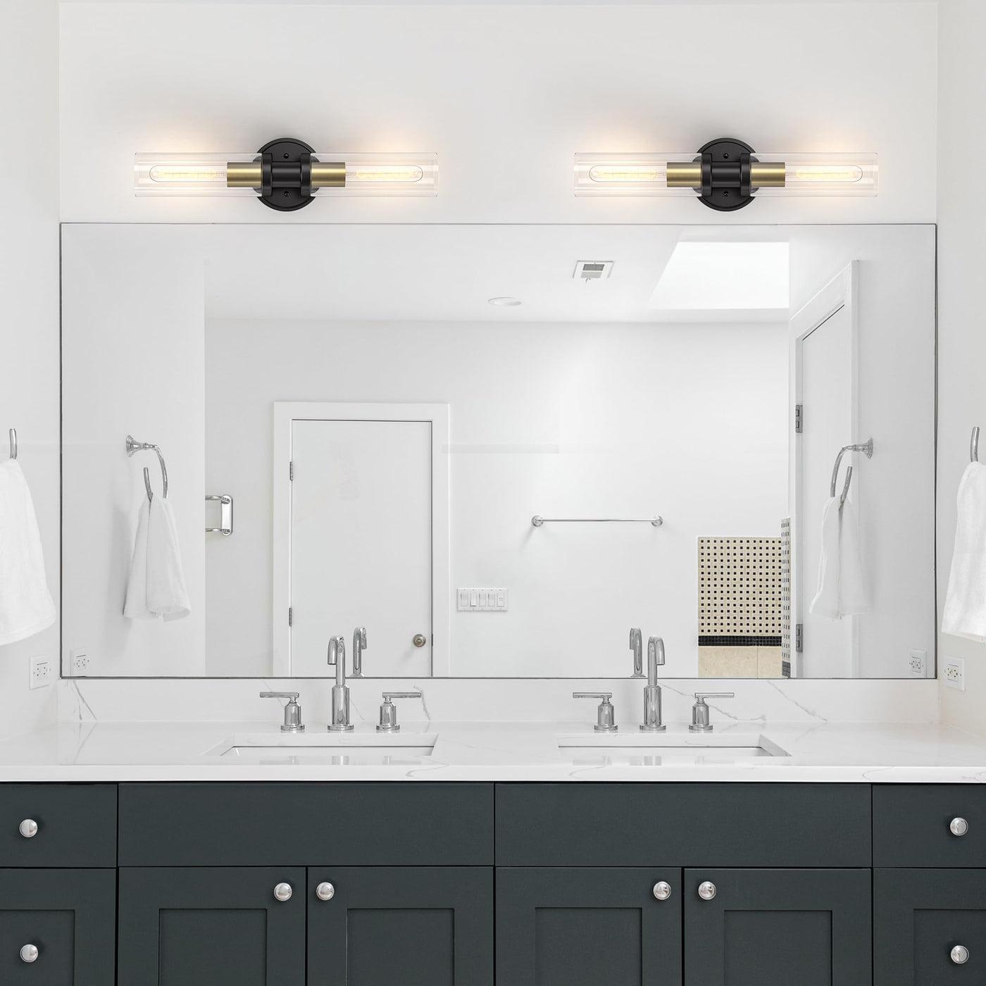 Upgraded vanity Light with Linear Glass Shade: Our black and gold bathroom light fixtures 2 lights come with 2 pieces of clear glass shades. Compared with other similar items without the shades, Espird 2 Light bathroom light is much safer when it is put in bathrooms. Besides, the glass lampshades add more delicacy to your bathroom and it is much easier to clean. Vertical or Horizontal Installation: All mounting hardware is included in the package. This black and gold vanity light is easy to install. You just need to connect wires and screw lampshades and bulbs(Not Included). And this black bathroom vanity light can be mounted at vertical angles and horizontal angles according to your needs. You don't need to worry about too small space to fit the bathroom light fixture in vertical way. Modern Black and Gold Bathroom Light Fixture--Matte black and brushed brass finish, and simple minimal design, our bathroom lights over mirror is classic. It won't rust easily since the durable materials and the rustproof paint. It can be dimmable when you use a compatible dimmer switch and dimmable light bulbs.
