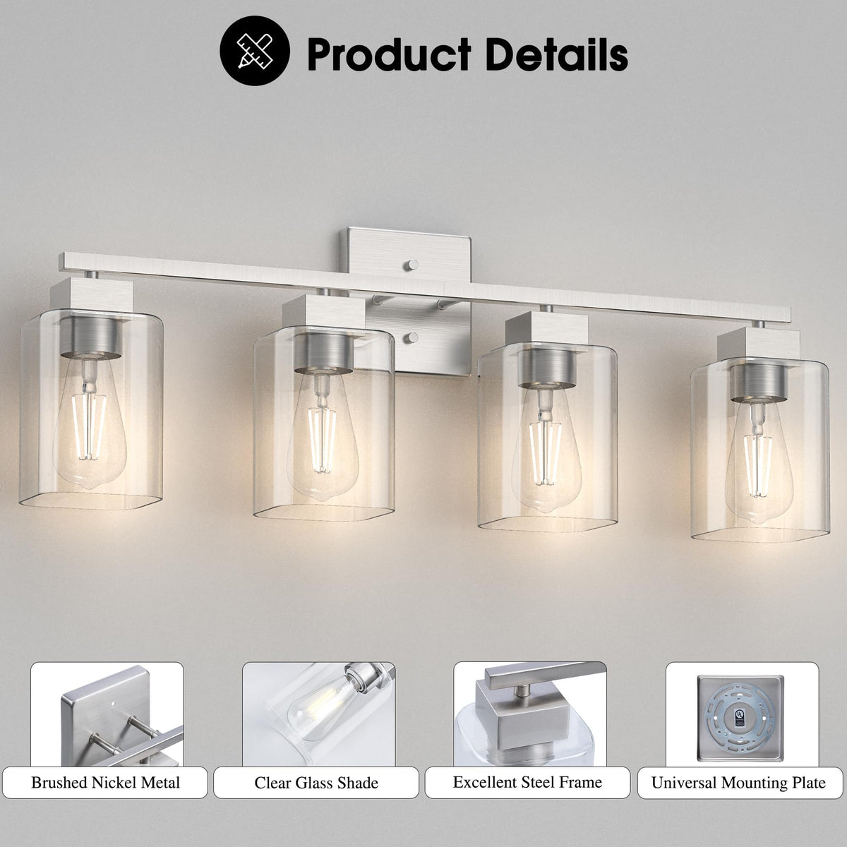 Our modern brush nickel 4 light vanity light fixtures with square style is suitable for bathroom & restroom & bedroom & living room & dining room
