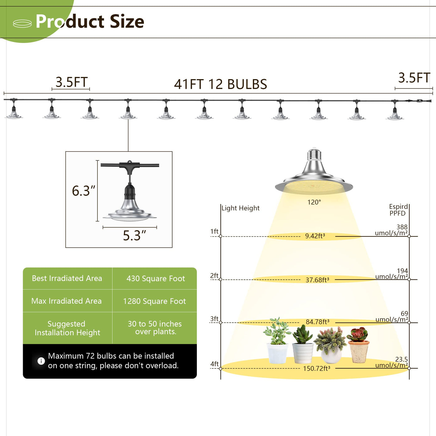 - **Flexible Installation Options**: The Espird grow light allows for end-to-end connectivity, enabling you to customize your setup to fit different spaces. One switch can power up to 120 lights at once, with a recommended installation height of 30 to 50 inches above your plants.