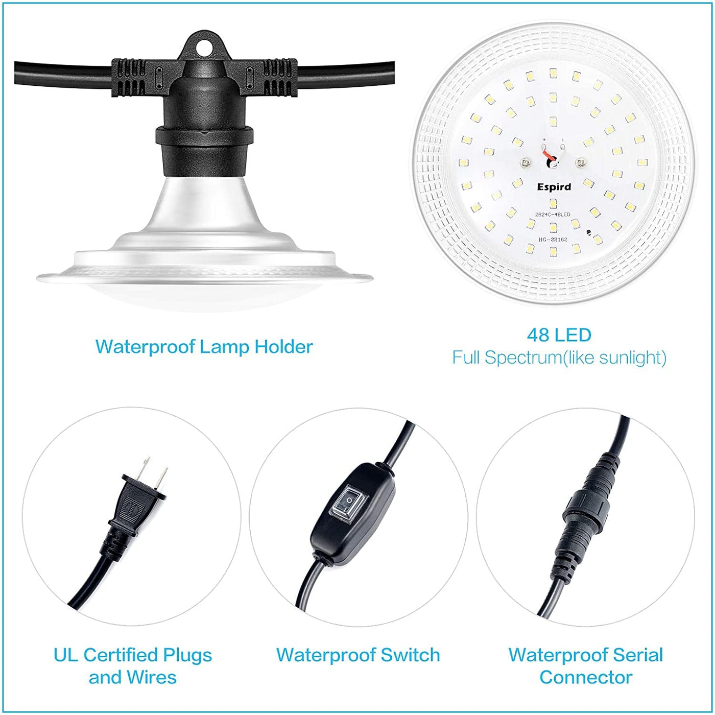 Espird LED Grow Light String with Timer - 12 Waterproof Full Spectrum Lamps for Greenhouse, Veg & Flower Growth, Black & Silver