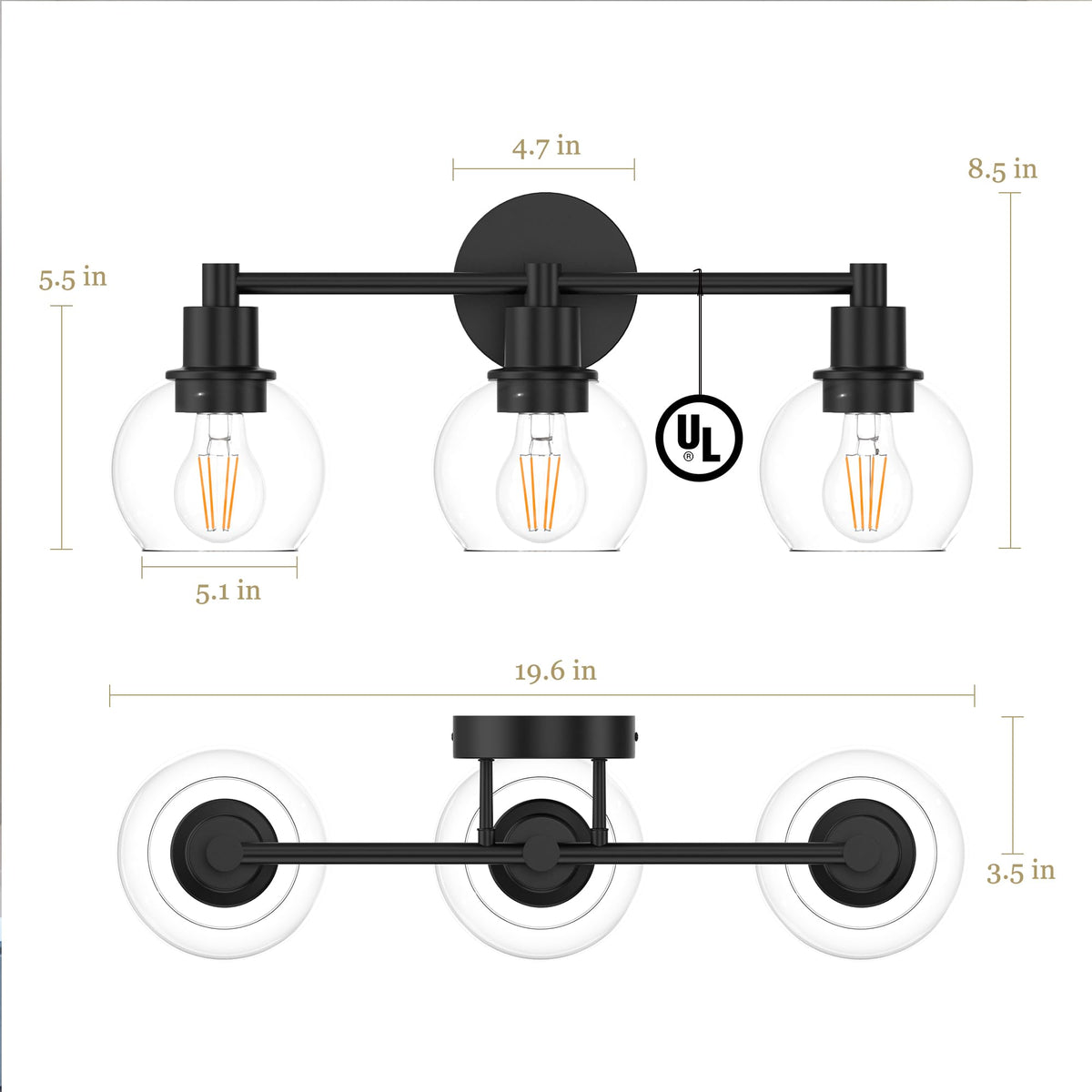 Q: What are the dimensions of the Espird 3 lights bathroom vanity light?A: The dimensions of the Espird 3 lights bathroom vanity light are 19.6 inches in length, 6 inches in width, and 8.5 inches in height, making it a larger fixture suitable for illuminating your bathroom effectively.