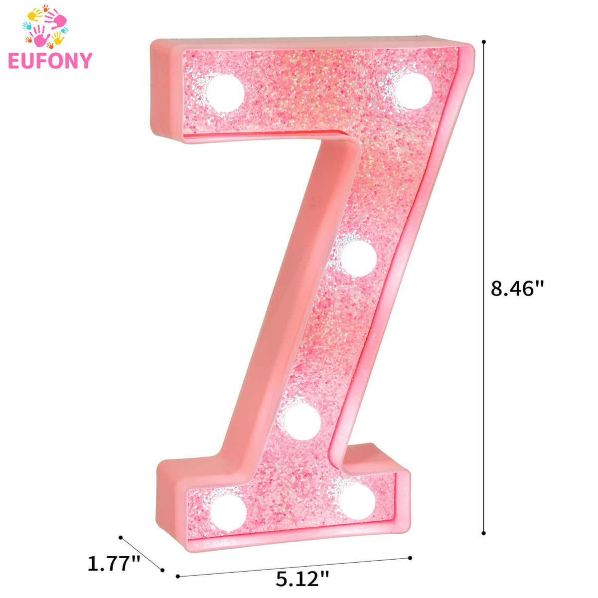 EUFONY Pink Glitter LED Marquee Light Up Number 7 with Cool White Lights, Battery-Powered Numbers sign for Girls Birthday Party