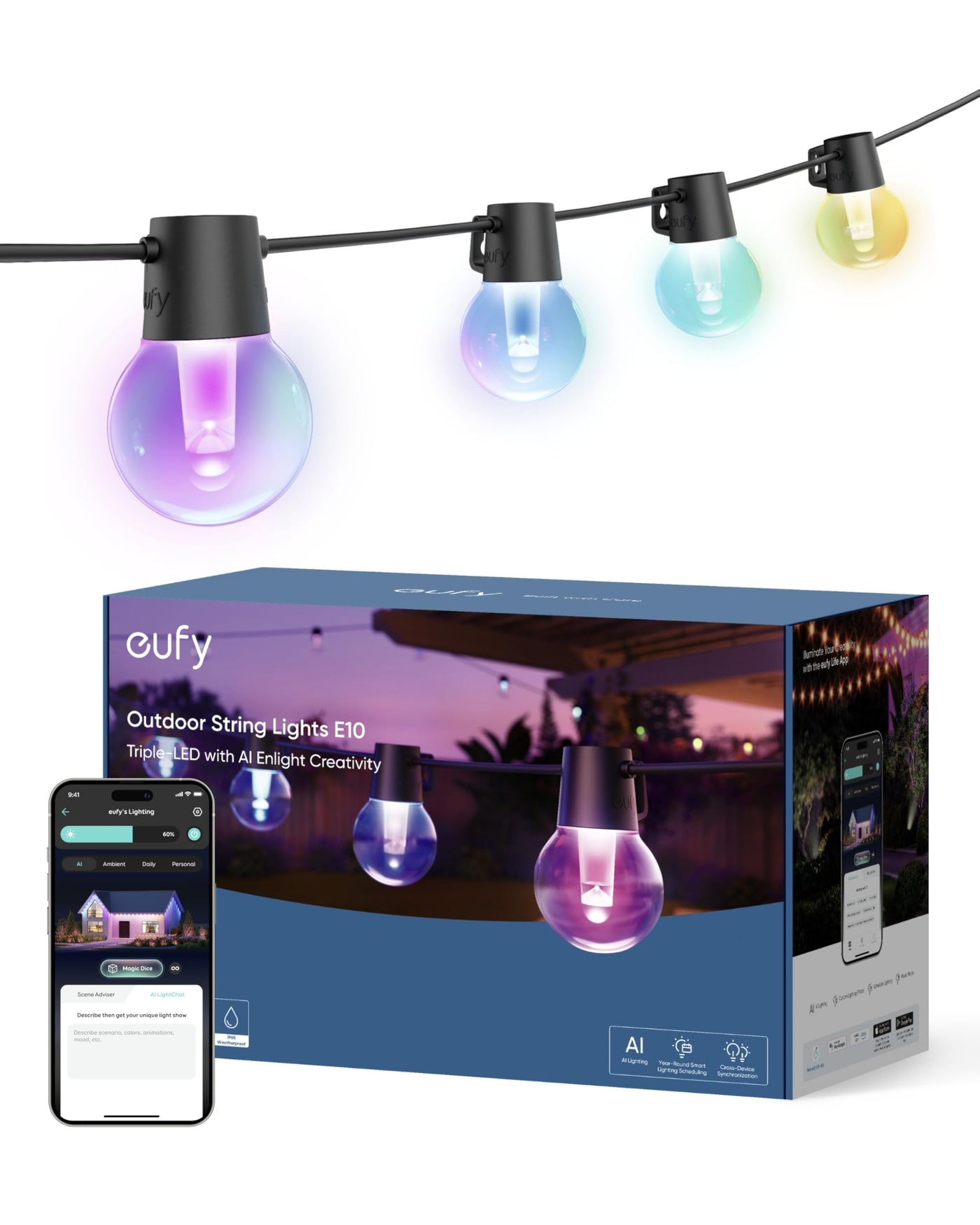 Eufy Outdoor String Lights E10, 96Ft With 30 Smart Rgbww Led Bulbs, Endless Ai Light Themes For Holidays, Party, Ip65 Waterproof For Patio, Fence, Balcony, Link With Cameras, Voice & App Control