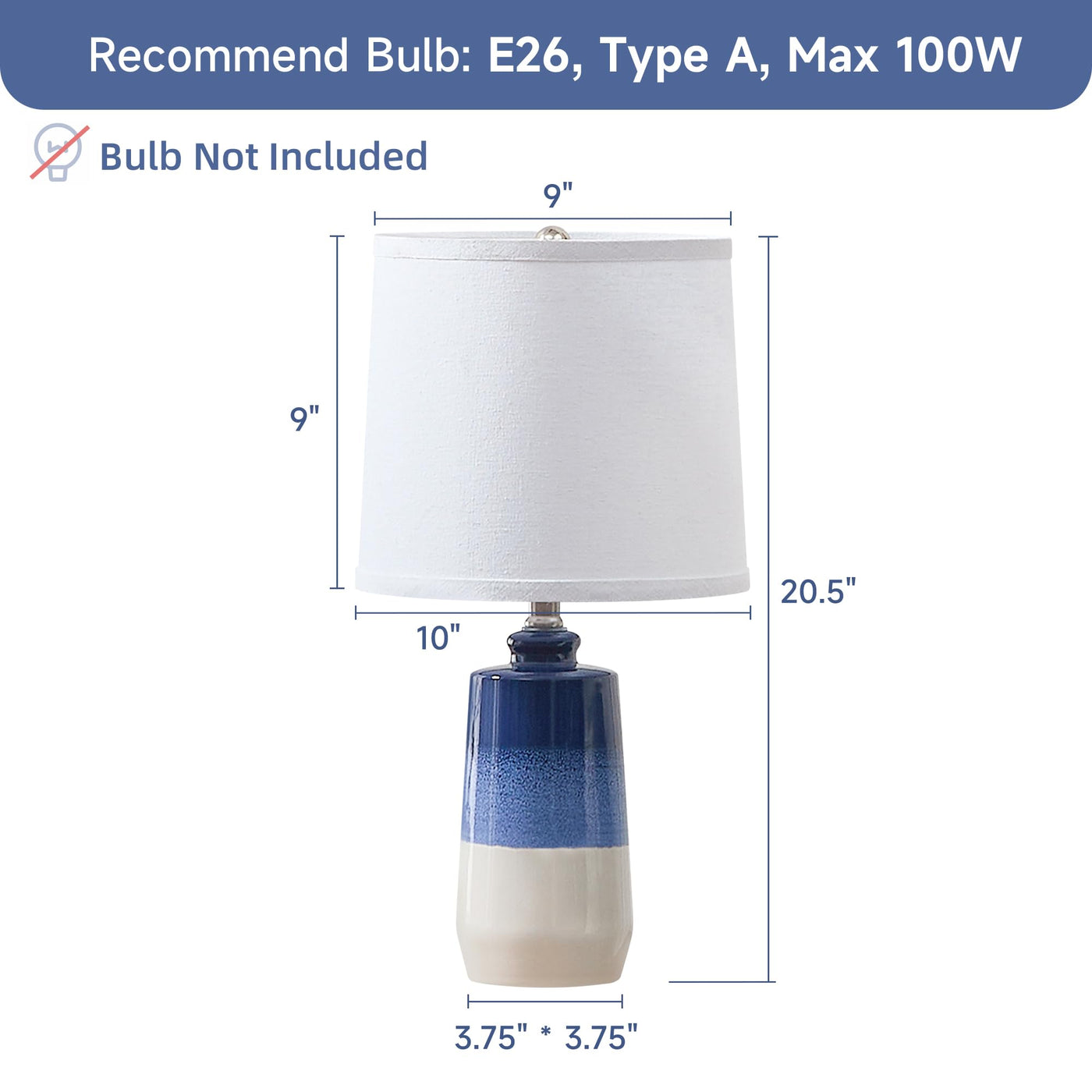 Q: What are the dimensions of the EUO 20.5" Ceramic Blue Lamps?A: The EUO 20.5" Ceramic Blue Lamps measure 10 inches in length and 10 inches in width, with a height of 20.5 inches, making them ideal for small spaces like nightstands and end tables.