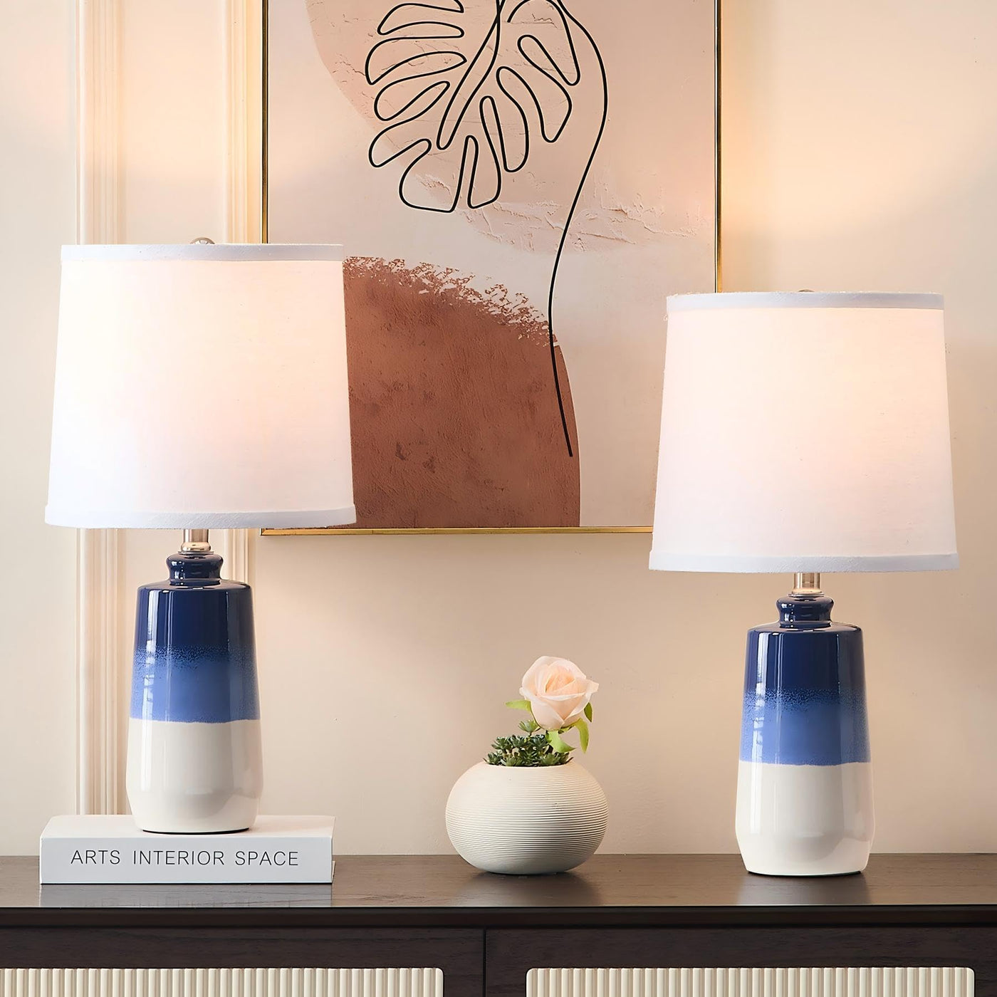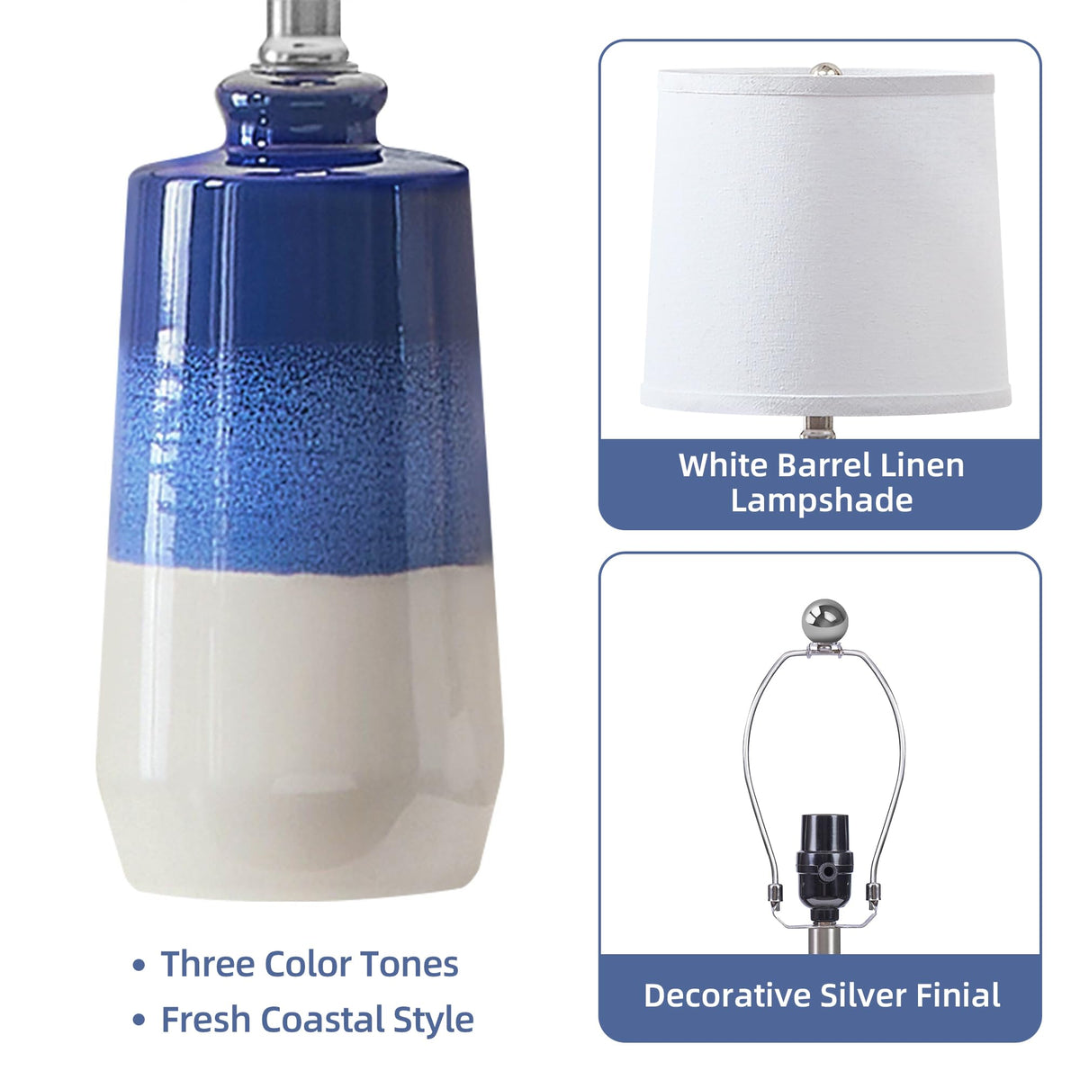 Q: Are these lamps suitable for modern and coastal-themed interiors?A: Yes, the EUO Ceramic Blue Lamps feature a minimalist design with a combination of navy blue, sea blue, and cream beige colors, making them a perfect fit for various decor styles, including modern, coastal, and farmhouse themes.