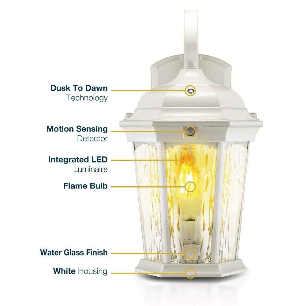 A step above simple outdoor lighting, the Euri Lighting Flame Lantern decorates, illuminates, and protects your space with style and efficiency. This innovative outdoor lantern is equipped with advanced dusk to dawn technology, motion sensor detection, and an enclosed flame bulb that features over 300 LEDs, making it an essential addition to any outdoor area. The enchanting flicker of the flame bulb, which activates at sunset, creates a warm and inviting atmosphere, while the full brightness feature ensures safety and security when motion is detected.