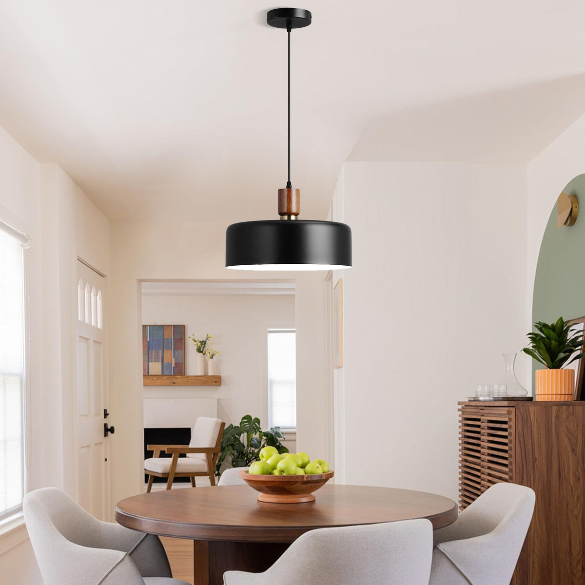 Q: What style is the Eustace pendant light designed to complement?A: The Eustace pendant light boasts a classic Scandinavian style with a modern twist, featuring a hammered metal dome shade, walnut wood accents, and a matte black finish that makes it appealing for kitchens, dining rooms, living rooms, and other spaces.