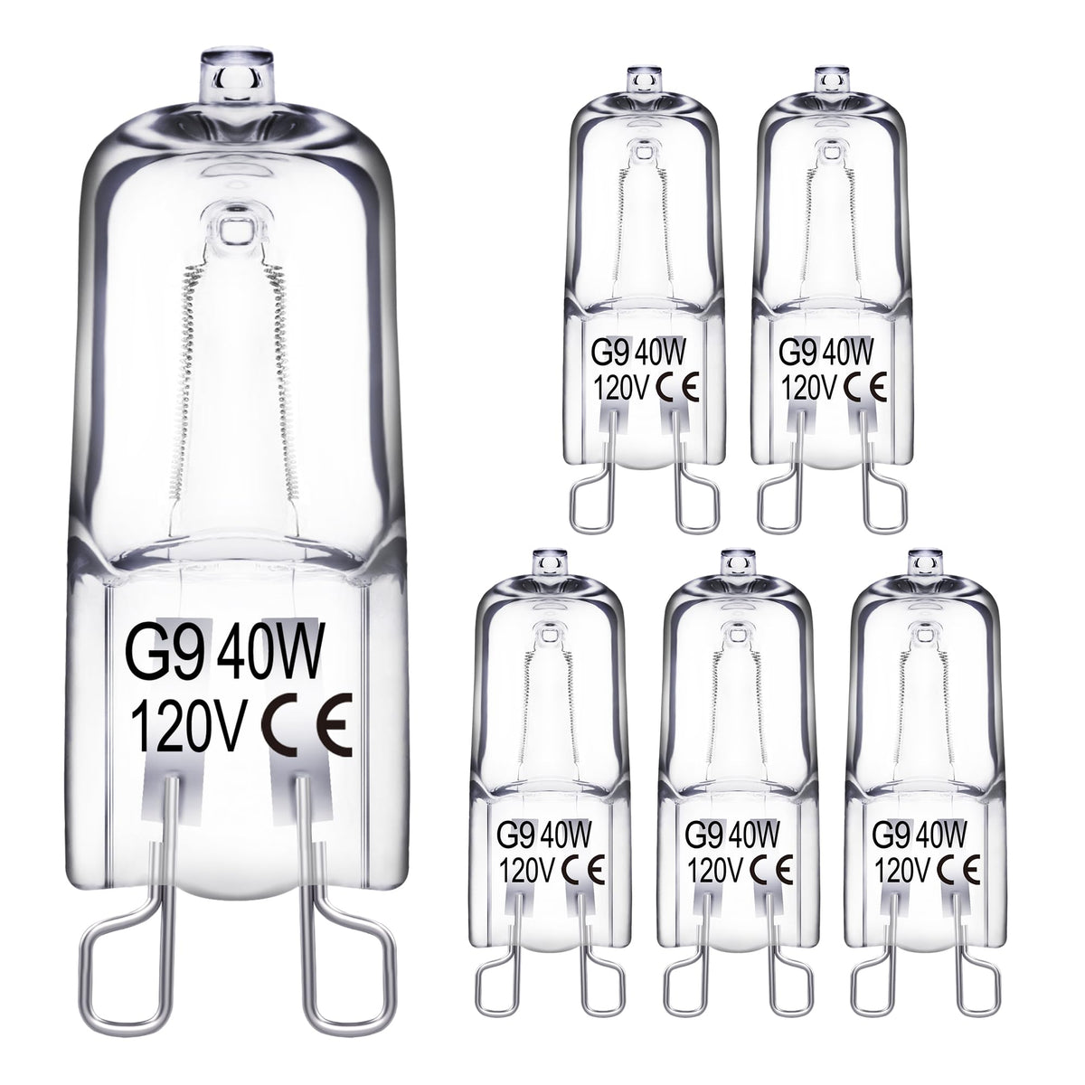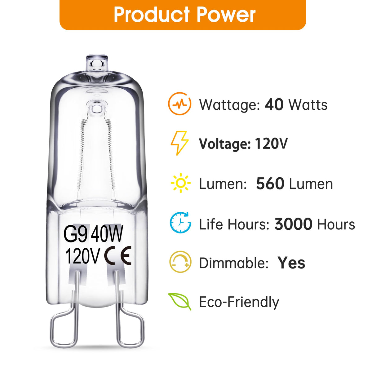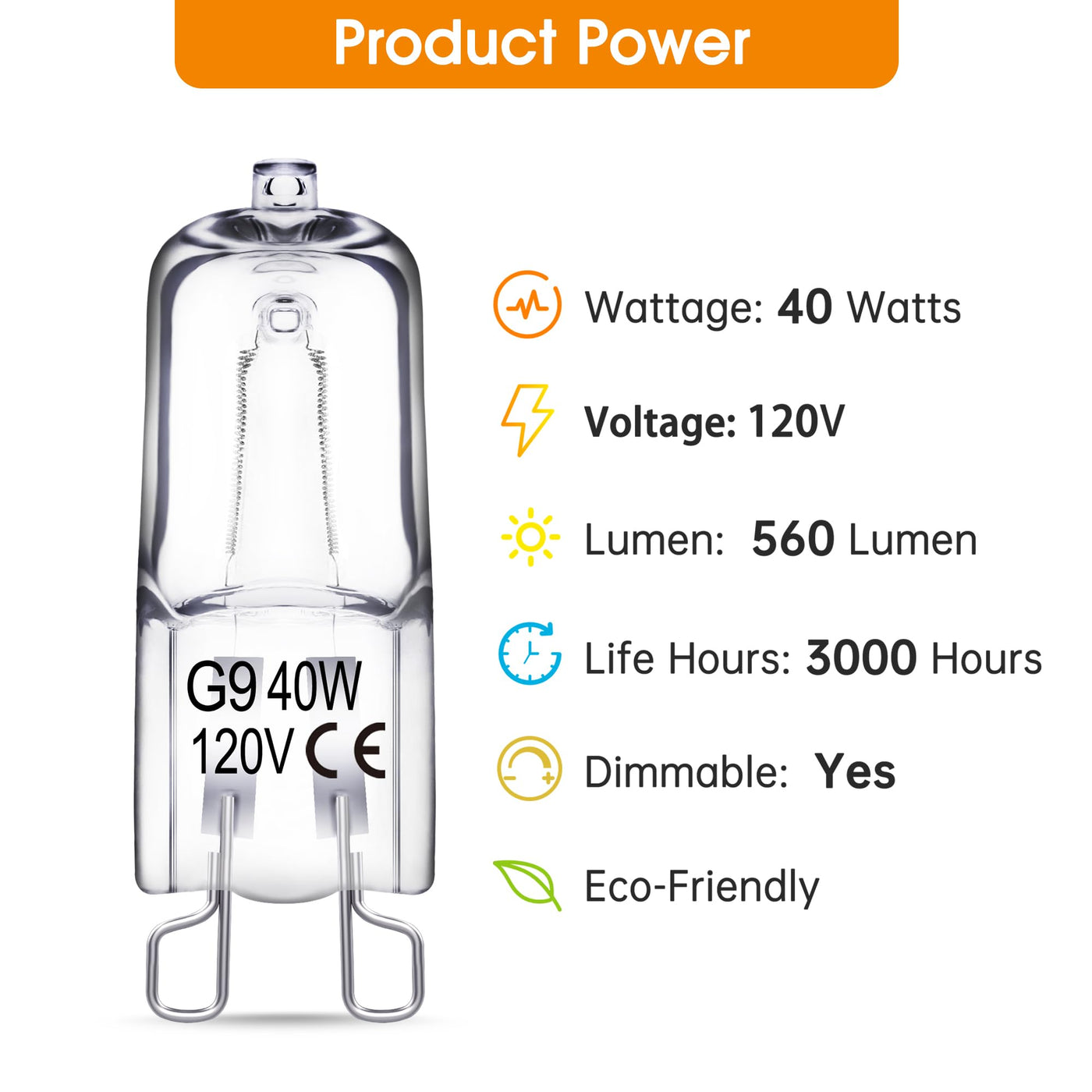 Product Specifications: Power: 40 Watts Voltage: 110V, 120V, 130V Ac Beam Angle: 360 Degree Color: 2800K Warm White Dimmable: Yes Color Rendering Index (Cri): 100Ra Package: 6 Pcs Of G9 Light Bulbs