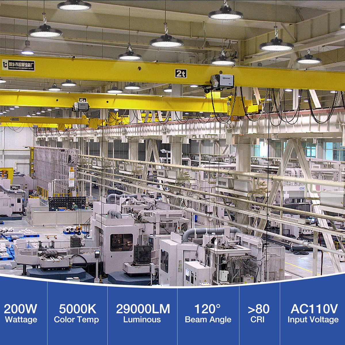 Q: What are the key features of the EVBFORU 200W UFO LED High Bay Light?A: The EVBFORU 200W UFO LED High Bay Light features high-quality SMD3030 LED chips, producing an impressive 29,000 lumens with a light efficiency of up to 140LM/W. It has a 120-degree beam angle for wide coverage, operates at a color temperature of 5000K for daylight-like brightness, and is designed for long-lasting performance with a lifespan of over 50,000 hours.