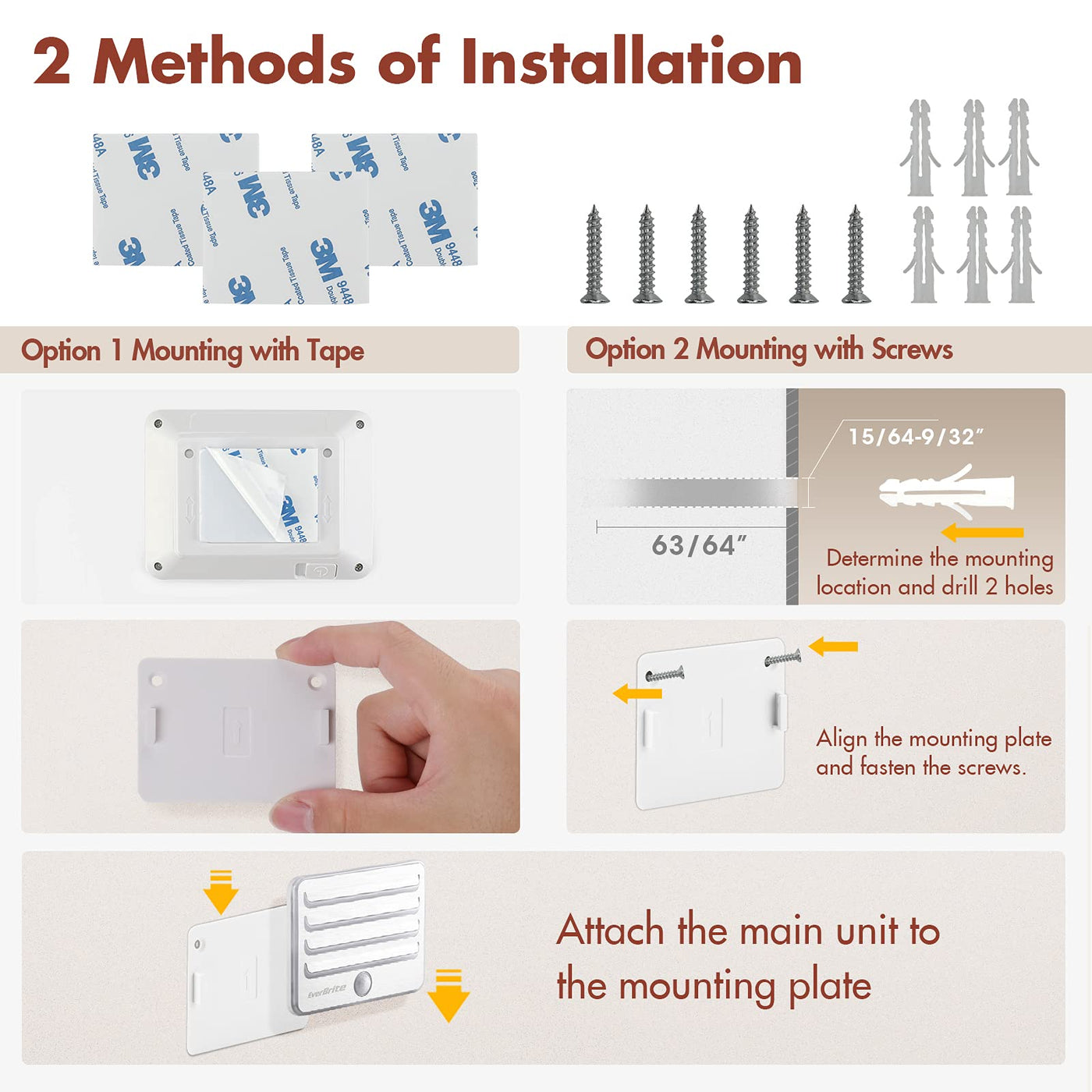 Q: What are the installation options for these night lights?A: The EverBrite Motion Sensor Night Lights offer versatile installation options. You can mount them using double-sided tape for a no-drill solution, or you can use screws and anchors for a more permanent setup. The choice depends on your preference and the location of installation.