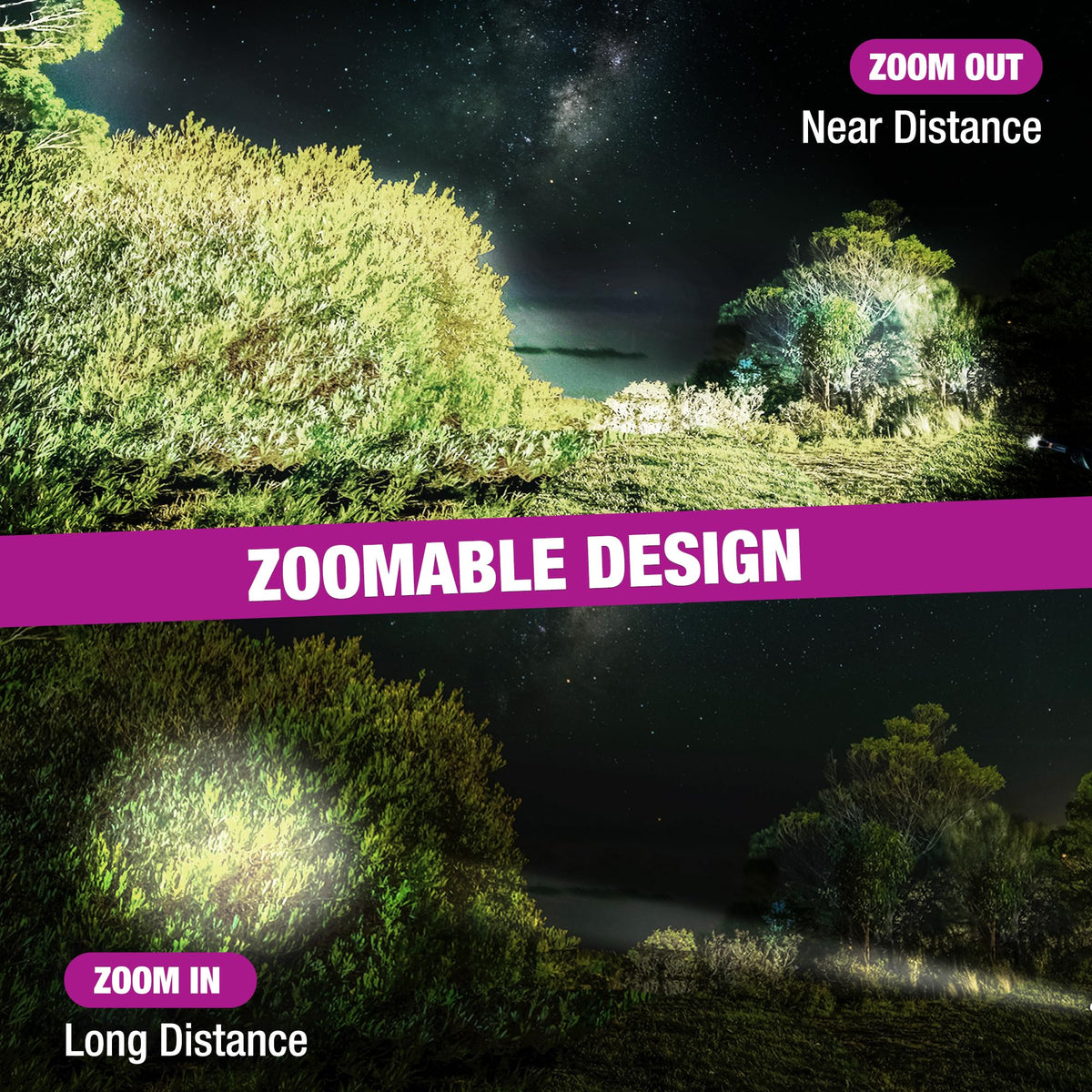 4 Lighting Modes & Zoomable Function: Choose from 4 lighting modes – high, low, strobe, and UV light. The adjustable focus lets you customize the beam size, whether you need broad area lighting or a focused spotlight that reaches up to 200 lumens.