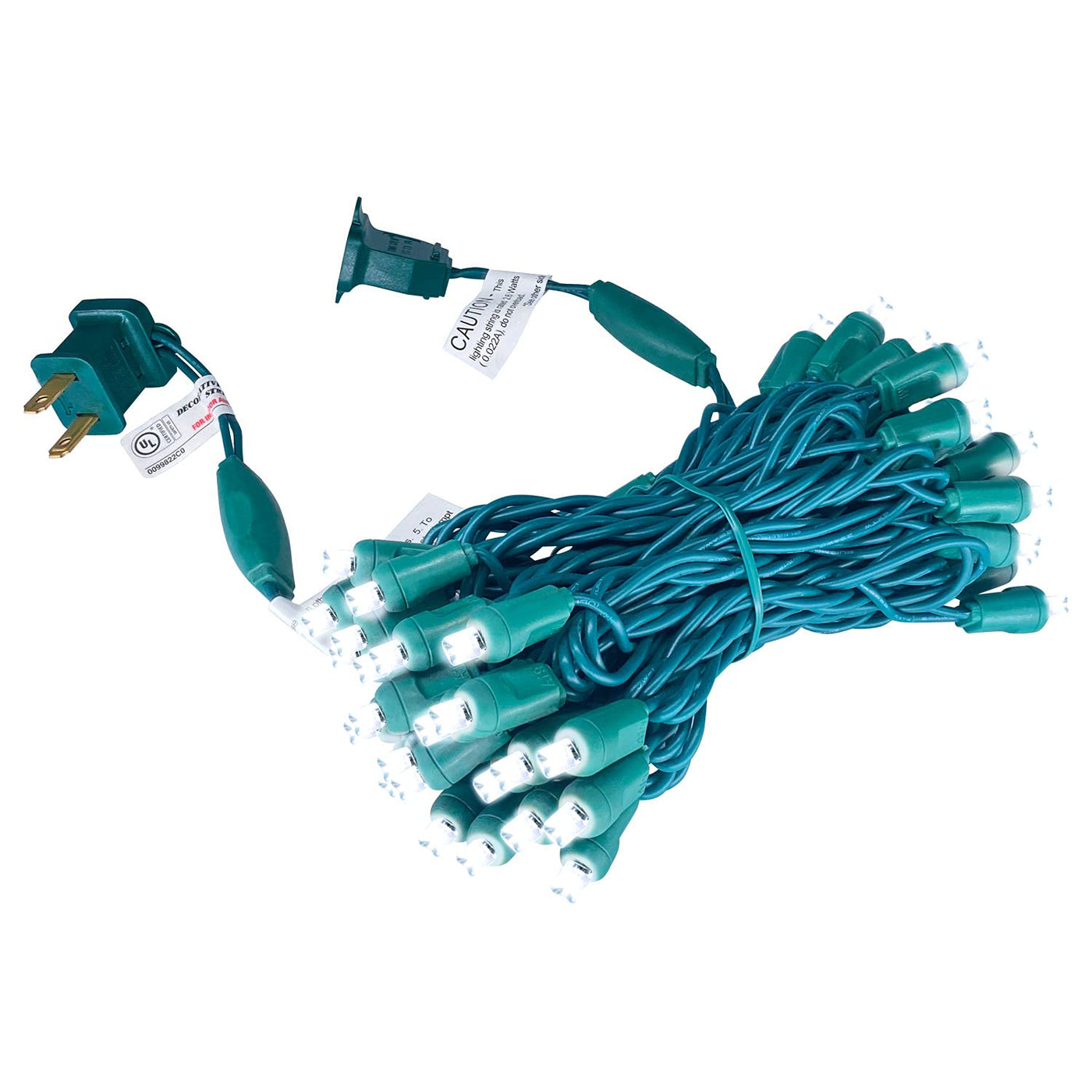 Q: What is the length of the UL Listed 50 Count 5MM Wide Angle White LED Christmas Lights?A: The total length of the LED string light set is seventeen feet, which includes a six-inch lead, four-inch spacing between bulbs, and a six-inch tail.