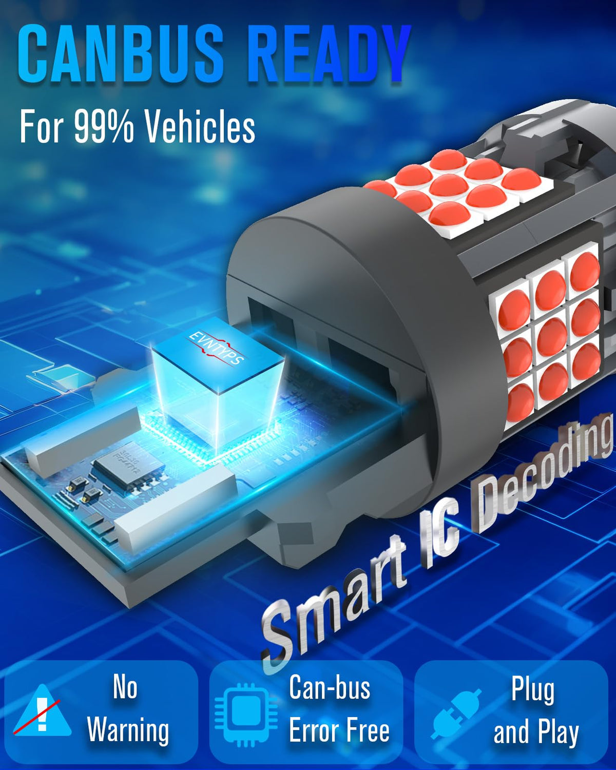 Q: Is the Evntyps 3157 LED bulb compatible with all vehicles?A: Yes, it is compatible with ninety-eight percent of vehicles due to its built-in CANBUS error-free feature, eliminating the need for additional load resistors.