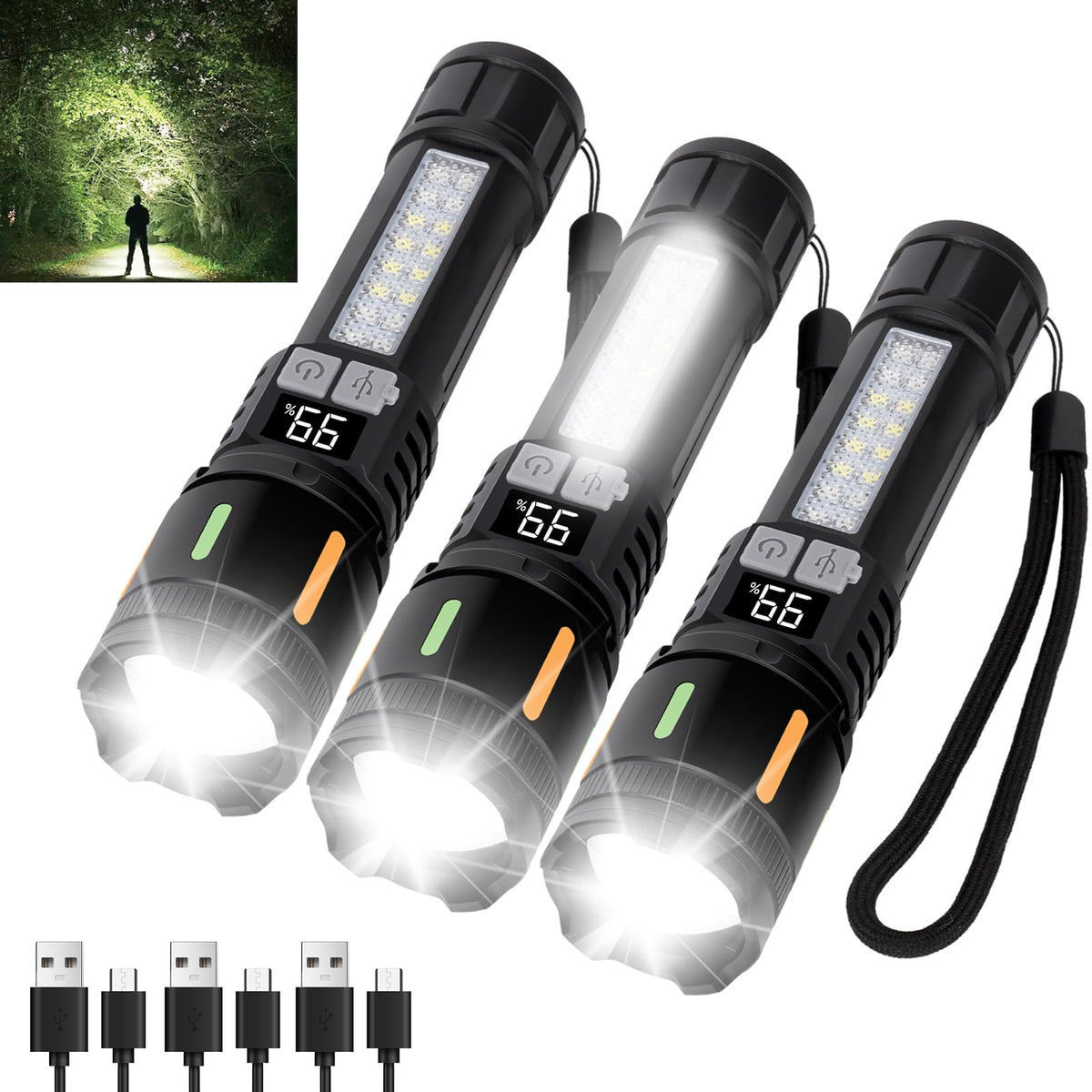 Ewenele Flashlights High Lumens Rechargeable 3 Packs, 990,000 Lumen Led Flashlight Battery Powered With 5 Light Modes, Side Ligh