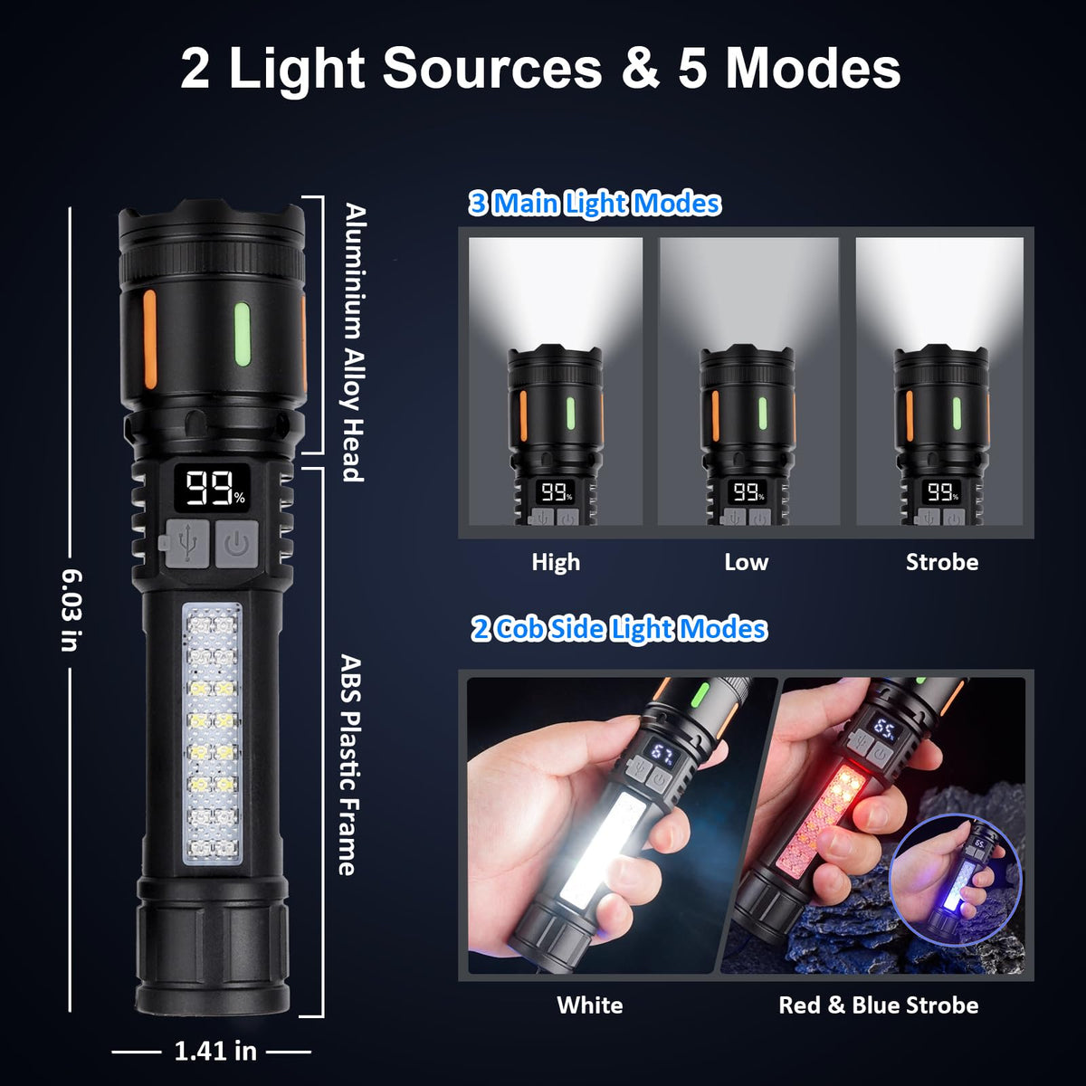 Flashlights High Lumens Rechargeable, 990,000 Lumens Led Flashlight Battery Powered With 5 Light Modes, Cob Side Light, Usb C, Waterproof, Zoomable, Blue & Red Flash, Handheld Flash Lights
